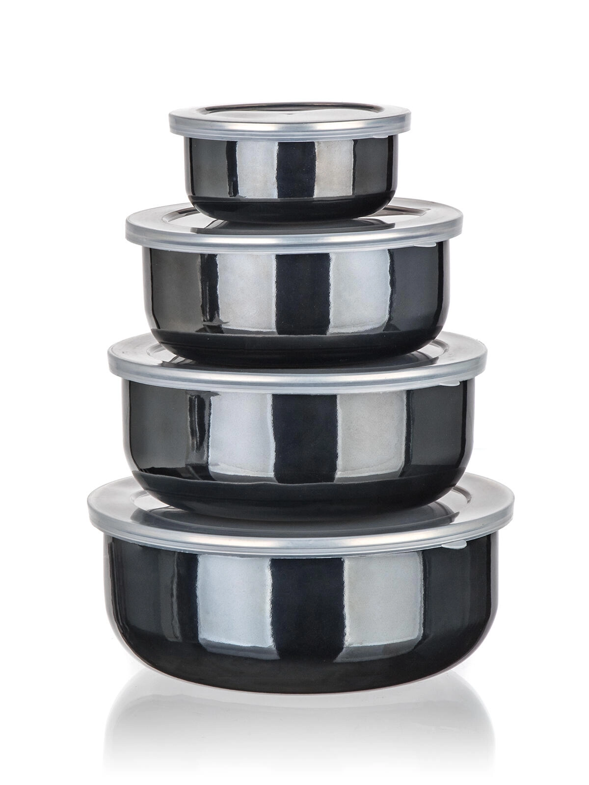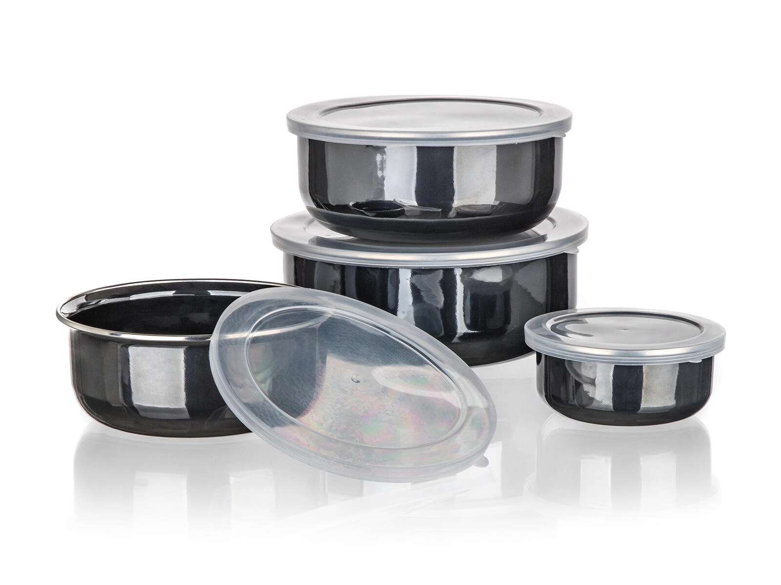 Praktická sada smaltovaných misek s plastovými víky METALIC Black v elegantní černé barvě pro každodenní použití. Čtyři velikosti s naskládáním do sebe šetří místo, těsnicí víčka pomáhají udržet potraviny déle čerstvé a odolný smalt zajišťuje snadnou údržbu. Ideální pro uchovávání potravin v lednici i na cestách.