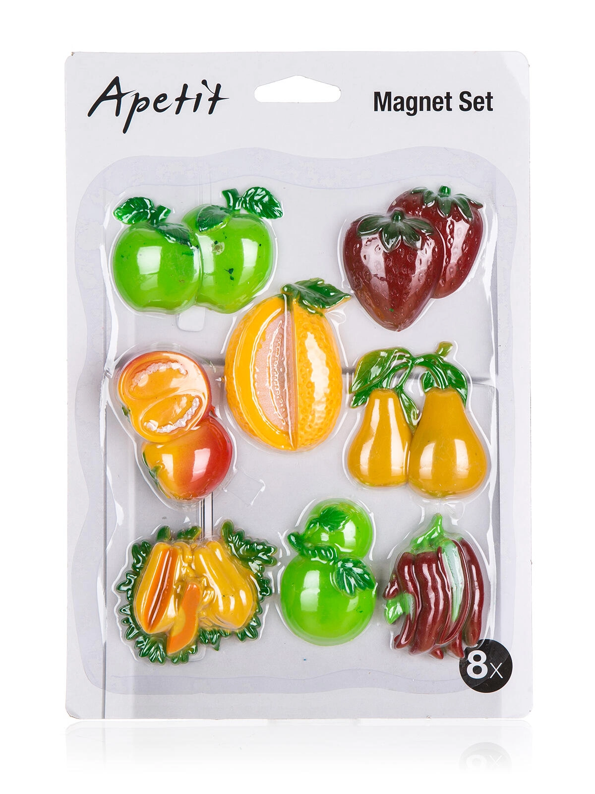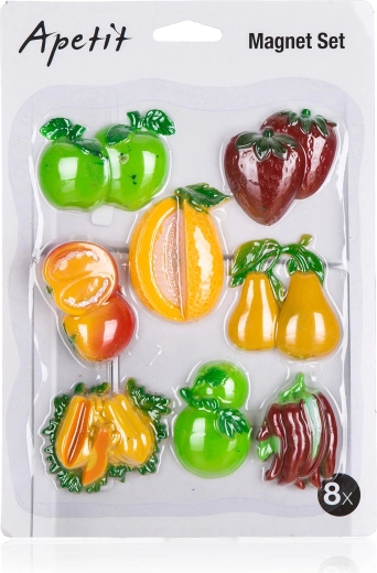 Stylová sada magnetek APETIT v balení po 8 kusech s motivy ovoce a zeleniny oživí každou lednici či magnetickou tabuli. Nabízí nejen dekorativní vzhled, ale i praktické využití – ideální pro připevnění receptů, vzkazů či nákupních seznamů.