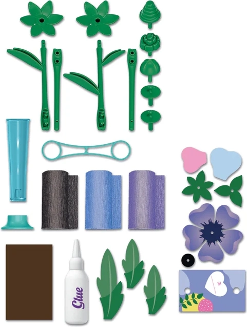 Tato originální sada na tvorbu květin vám umožní vyrobit dvě elegantní sasanky s bohatými okvětními lístky a zelenými stonky. Balení zahrnuje předstřižené a skládatelné prvky, které se jednoduše spojí do atraktivní aranže. Díky jasným ilustracím je postup snadný i pro začátečníky.