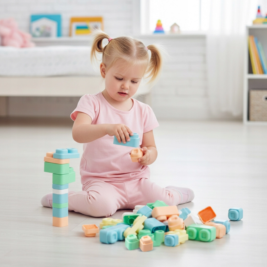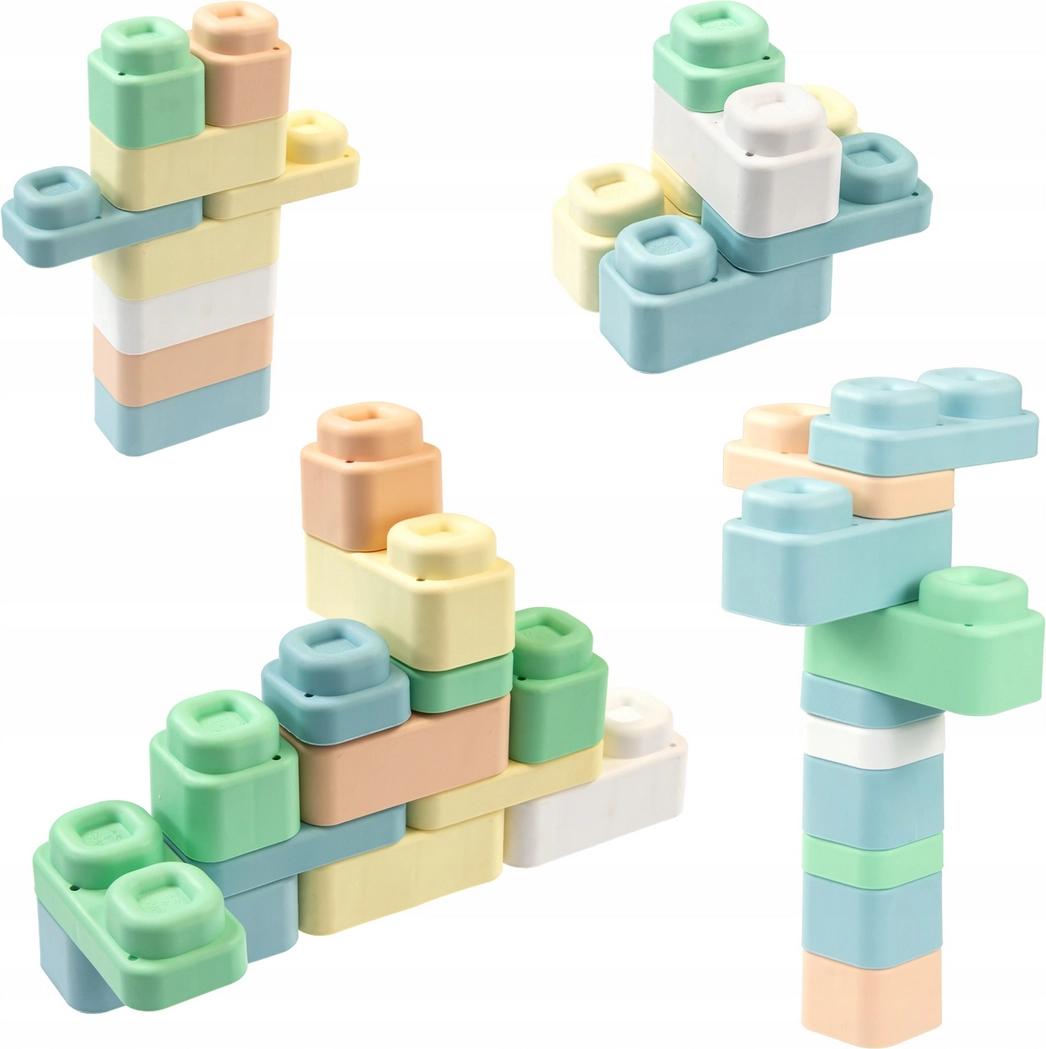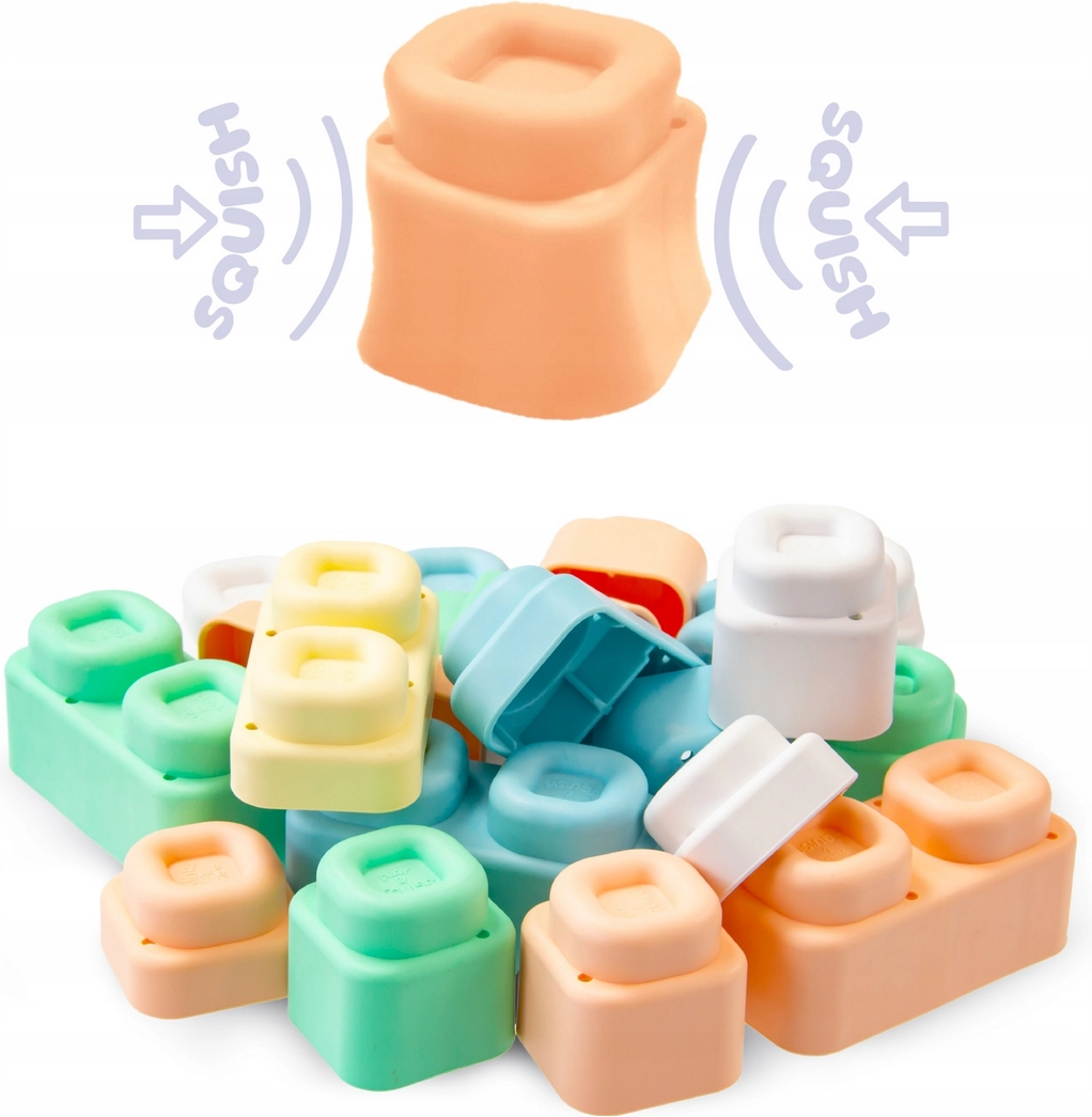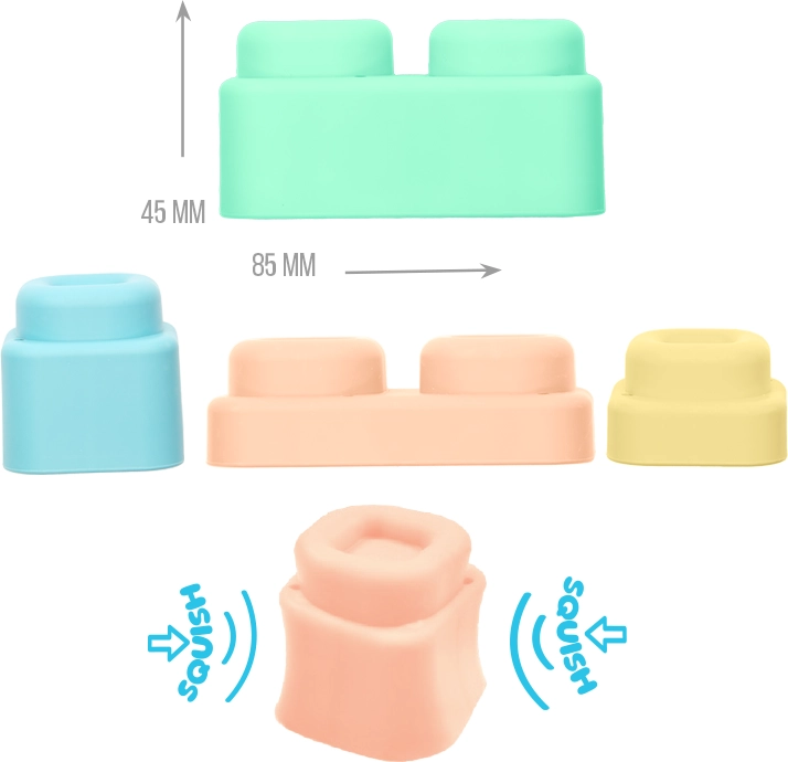 Materiál je měkký, pružný a certifikovaný, takže děti mohou kostky i podložky bezpečně mačkat, kousat nebo házet bez rizika poranění. Díly se dají snadno spojovat a rozpojovat, což posiluje jemnou motoriku, koordinaci ruka–oko a samostatnost při hraní.