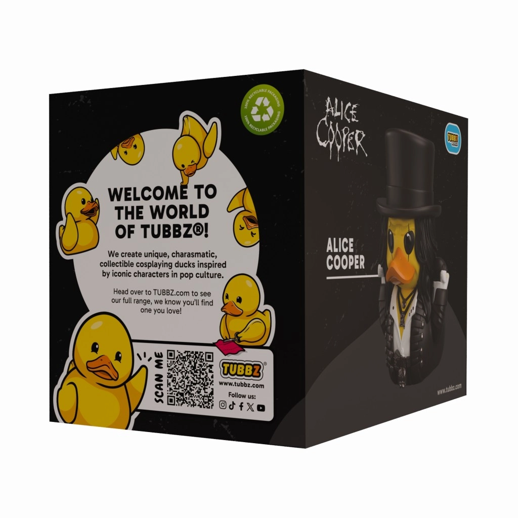 Sběratelská kachnička Tubbz inspirovaná legendárním rockerem ALICE COOPER přináší ikonický černobílý make-up, temný outfit a kvalitní vinylové zpracování. Ideální jako licencovaný dárek, dekorace i sběratelský kousek pro fanoušky rocku.