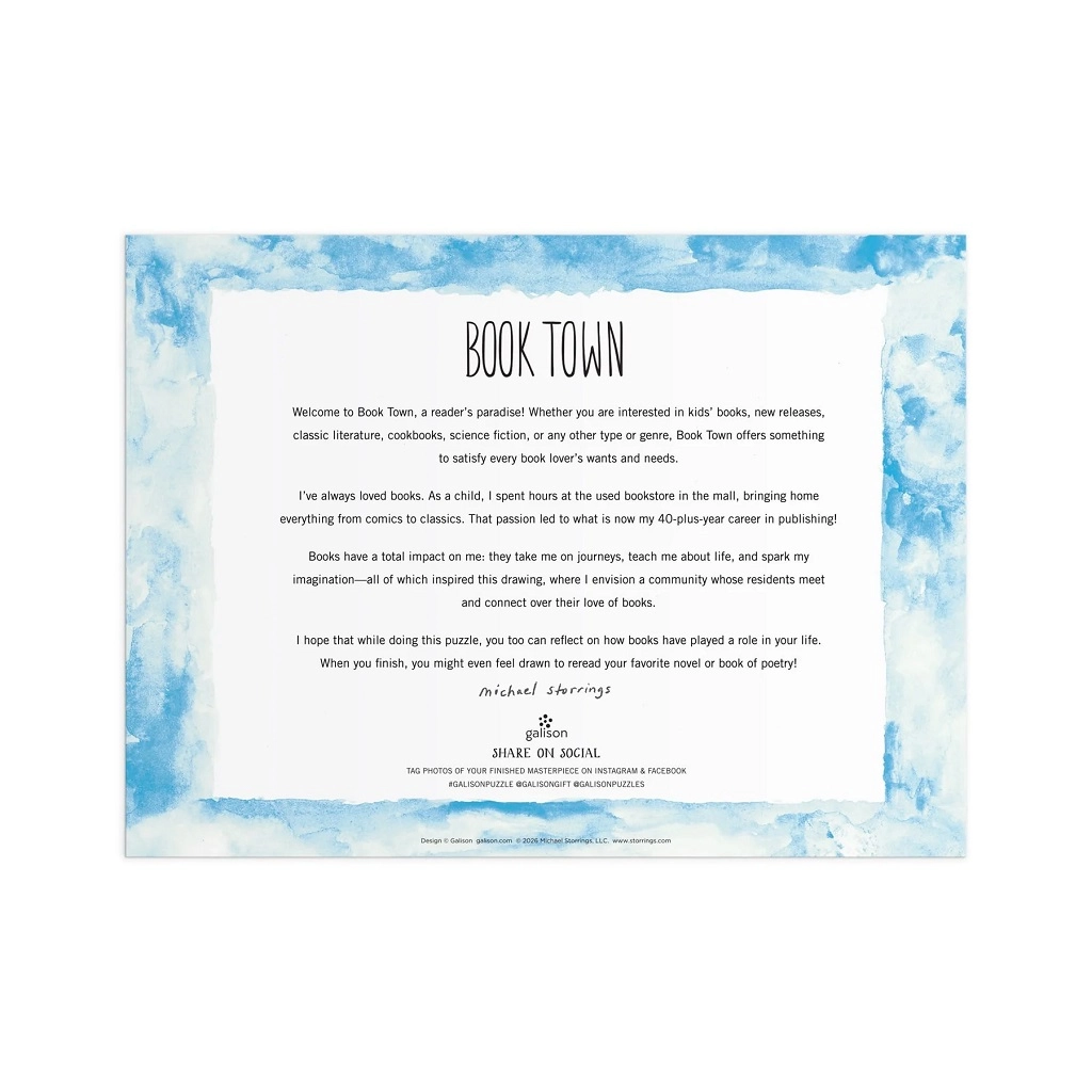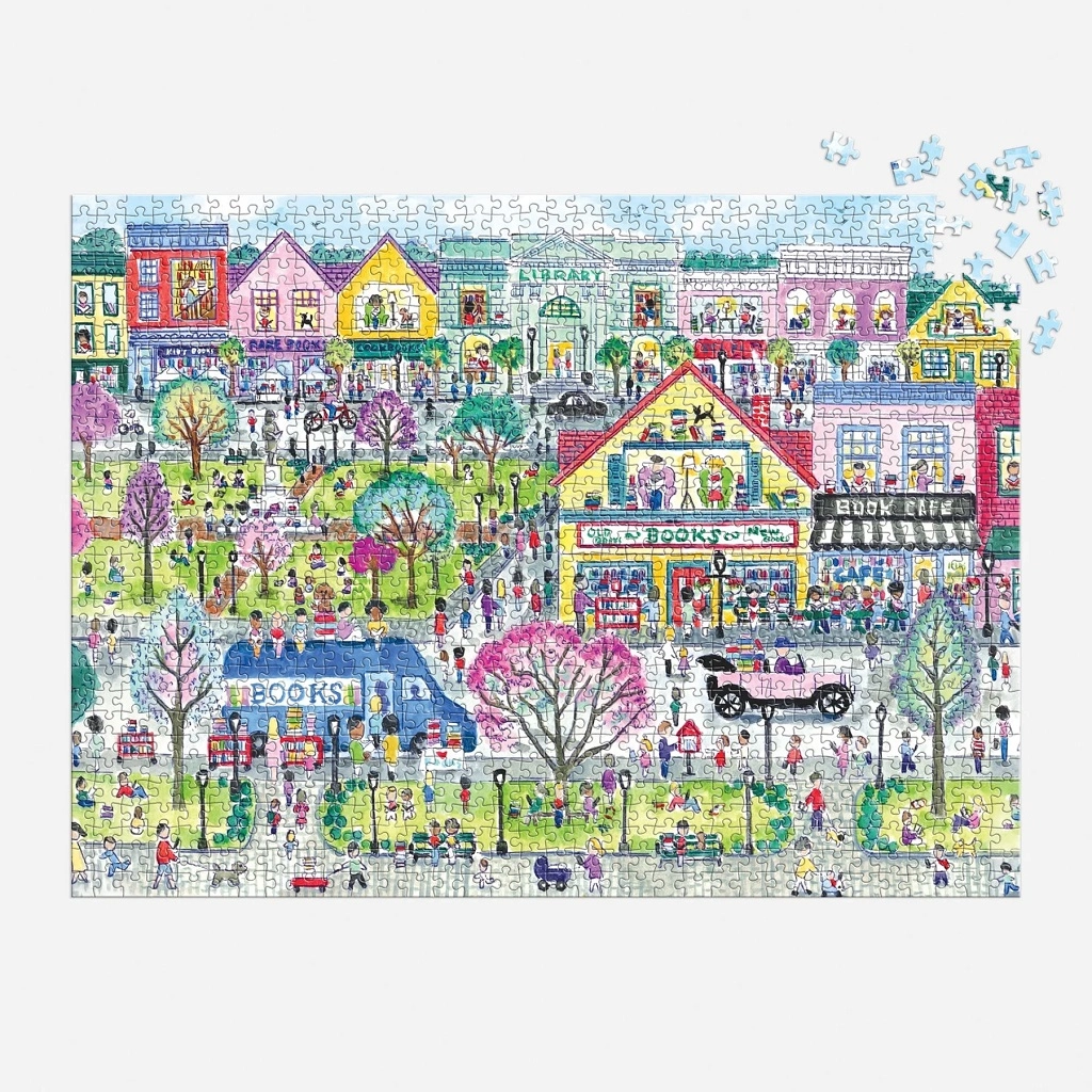 Vstupte do světa knih s krásným puzzle Knižní město od značky Galison podle ilustrace umělce MICHAEL STORRINGS. Barevná a detailní kompozice o 1000 dílcích zachycuje živé ulice plné knihkupectví, čtenářů a festivalové atmosféry. Díly jsou pevné, přesně vyřezané a výborně do sebe zapadají, takže si užijete pohodové i náročnější skládání. Vyrobeno z FSC certifikovaného recyklovaného papíru s netoxickými barvami.