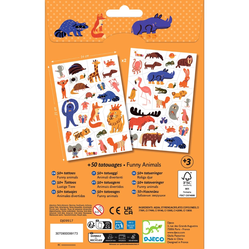 Dopřejte dětem zábavu s barevnými tetováními DJECO. Sada nabízí pestré motivy zvířátek, které se snadno přenášejí pomocí vody a na kůži vypadají jako skutečné. Ideální na dětské oslavy, karnevaly i jako malá odměna.