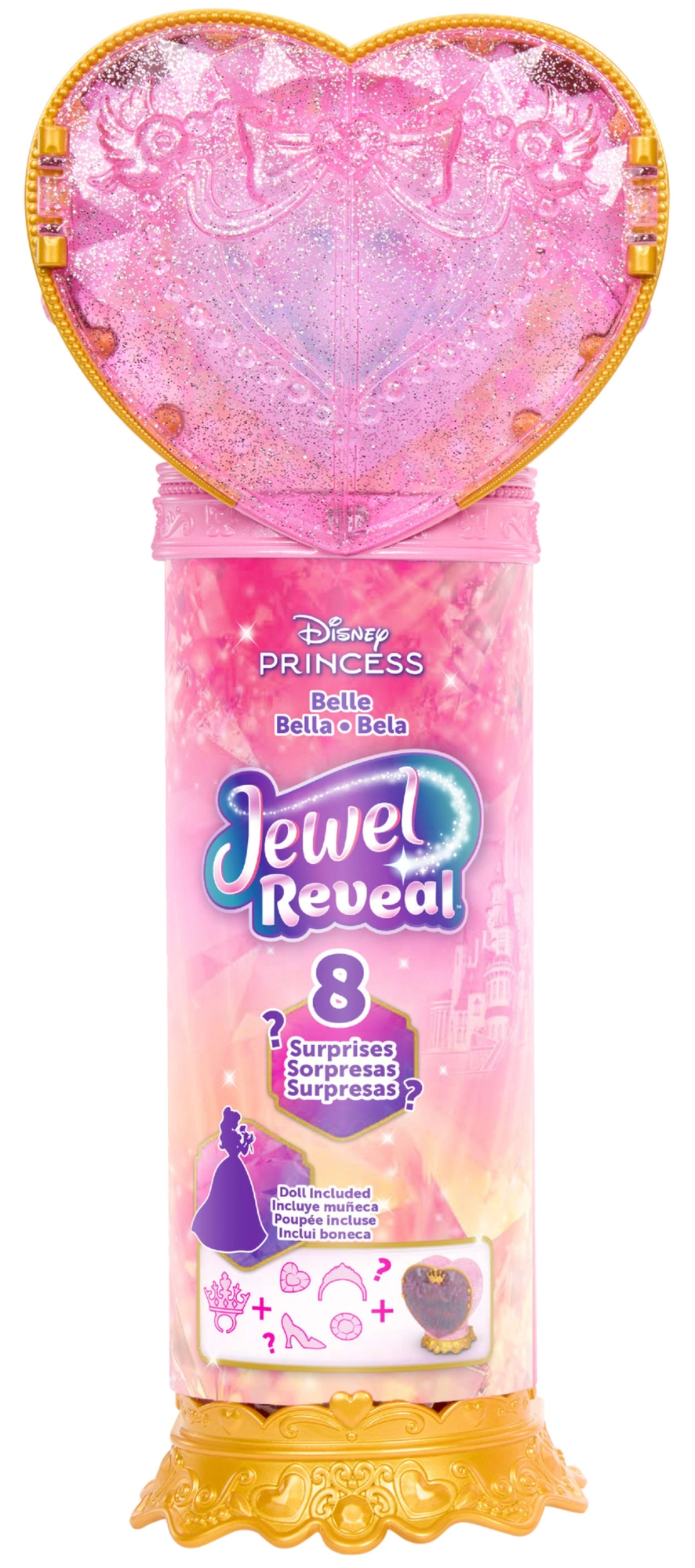 Objevte kouzelnou zábavu s loutkou Disney princezna Bella ze série Jewel Reveal. Čeká na vás 8 překvapení, třpytivé srdíčkové balení sloužící jako šperkovnice, stylové doplňky (tiára, botičky, „klenoty“) a prstýnek pro dítě. Ideální pro kreativní převlékání a pohádkové příběhy.