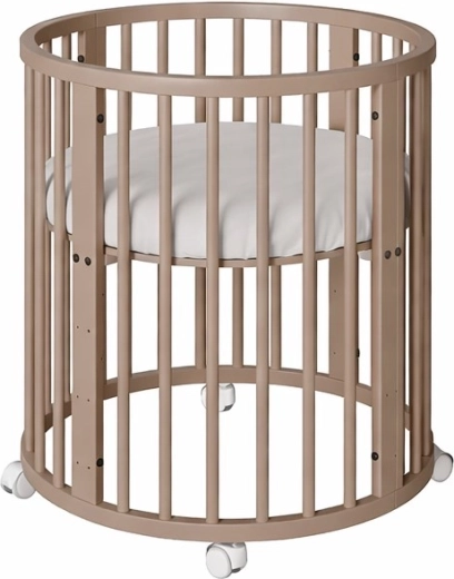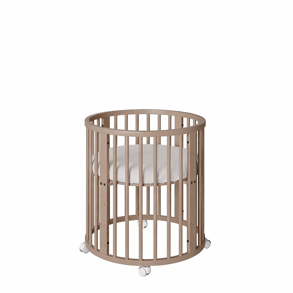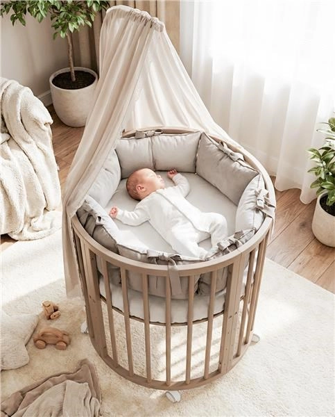 3 funkce v jedné postýlce: • Mini kulatá postýlka (Ø 70 cm) pro novorozence – útulný, bezpečný prostor i do menších místností. • Postýlka 140 × 70 cm – pohodlné spaní zhruba do 3 let; po snížení roštu lze využít jako ohrádku pro hru a bezpečné vstávání. • Postel/gaúč – s nízkou bočnicí pro samostatné nastupování dětí do cca 5 let.