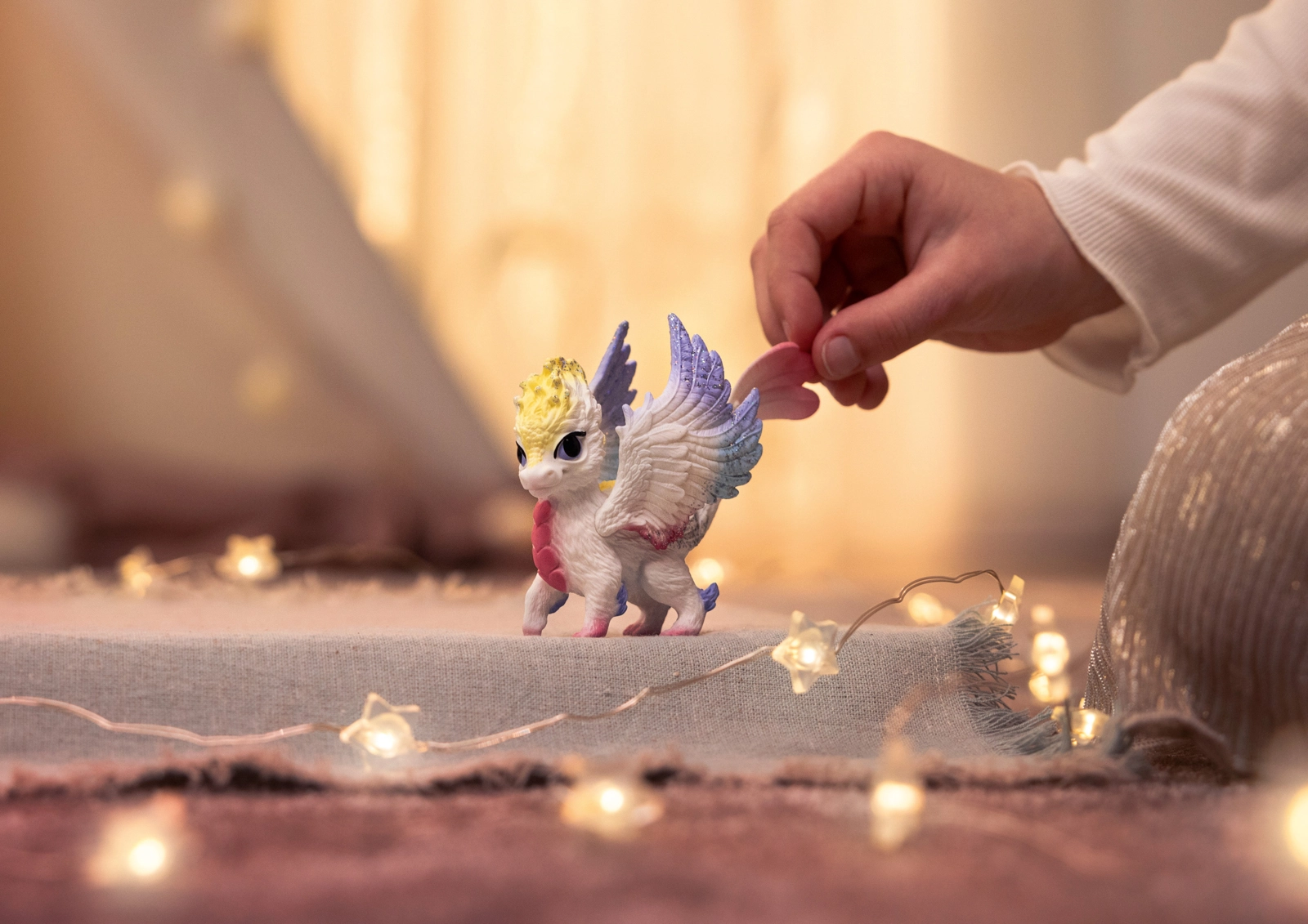 Objevte kouzlo světa BAYALA s roztomilým duhovým dráčkem, který miluje slunce i déšť – přesně ty chvíle, kdy se na obloze rodí duhy. Figurka nadchne precizním ručním malováním, výraznýma fialovýma očima a třpytivými křídly, která působí, jako by se každou chvíli měla vznést.