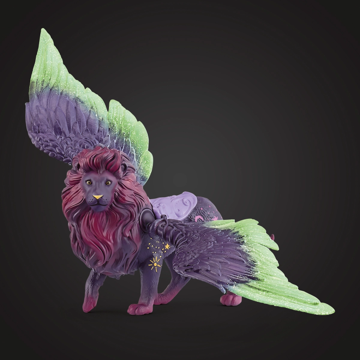Objevte majestátního měsíčního lva – strážce noci ve světě BAYALA. Jeho tmavý kožich s fialovo-zlatými hvězdami, bohatá hříva a zlatě lesknoucí se čumáček z něj dělají nepřehlédnutelnou postavu každé fantazijní výpravy. Díky velkolepým křídlům se elegantně vznáší noční oblohou a dohlíží na klidný spánek všech obyvatel.
