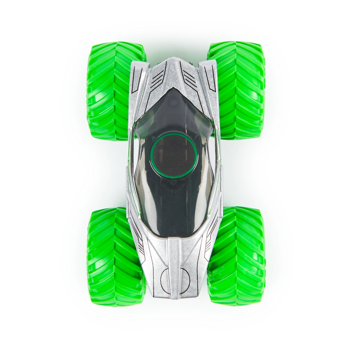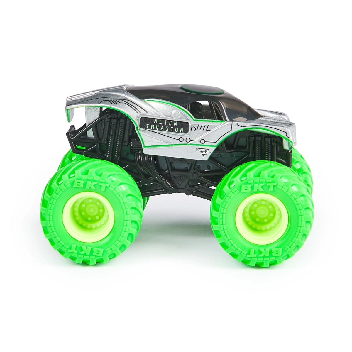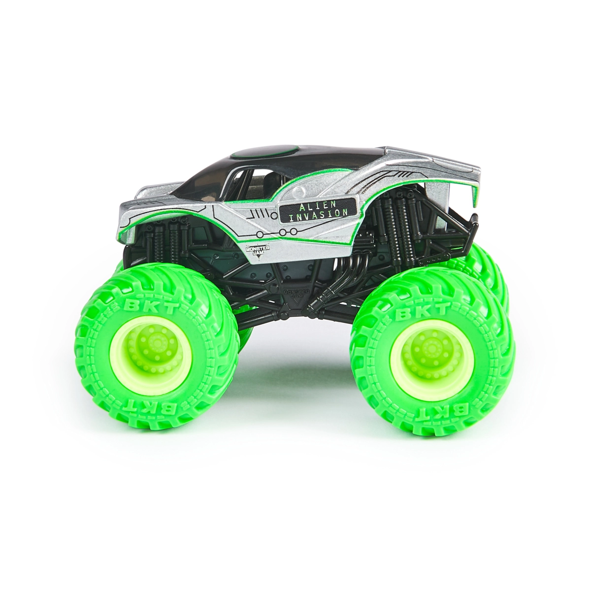 Neonově zelené pneumatiky BKT a stříbrno‑černá karoserie zaujmou na první pohled. Připraveno na odvážné skoky a fantazii bez hranic.