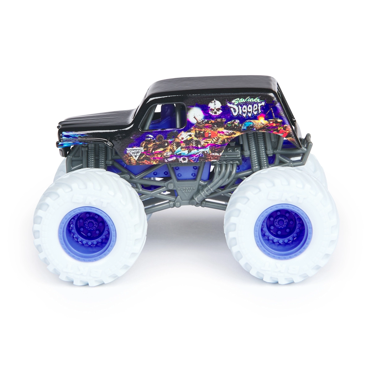 Objevte oficiální Monster Jam v měřítku 1:64 – detailní kovový model s autentickým podvozkem a pneumatikami BKT. Skvělý do sbírky i na hraní, v assortu najdete populární trucky jako El Toro Loco, Grave Digger, Megalodon, Blue Thunder či Alien Invasion. Odolné zpracování, výrazná grafika a volně se otáčející kola zaručí hodiny akční zábavy.
