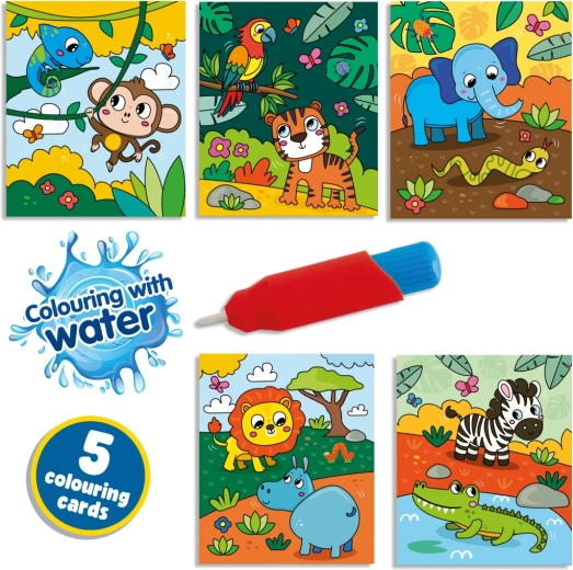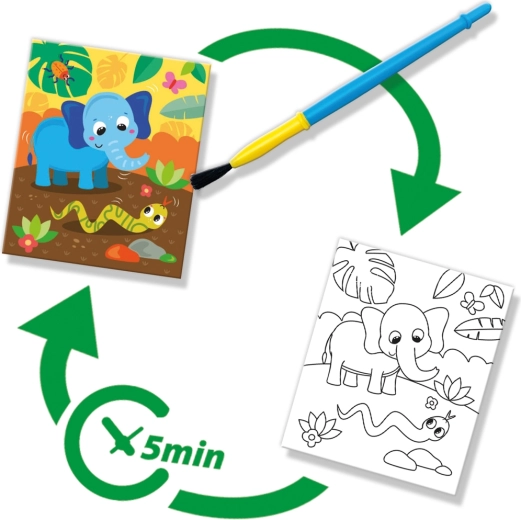 Malování vodou – Safari přináší dětem zábavné a čisté tvoření bez kapky barvy navíc. Jednoduše naplňte přiložený štětec vodou a tahem po stránce odhalte skryté barvy a detaily zvířat ze safari. Po vyschnutí se stránky vrátí do původního stavu, takže si děti mohou svoji oblíbenou aktivitu užívat znovu a znovu.