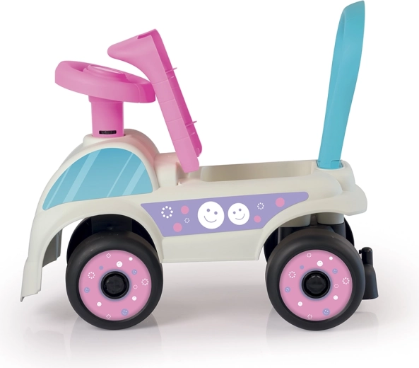 Stylové dětské odrážedlo v bílo‑růžovém provedení je navržené pro bezpečné objevování světa doma i na terase. Díky nízkému sedu se děti snadno odrážejí nožičkami, procvičují rovnováhu a postupně získávají jistotu při pohybu. Zadní madlo poslouží rodičům k přidržení i dětem jako opora při prvních krůčcích.