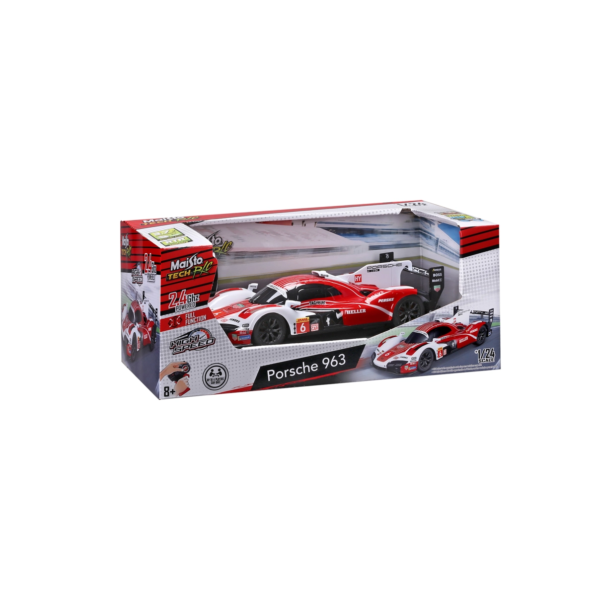 Rychlý a realistický RC model PORSCHE 963 v měřítku 1:24 pro domácí i venkovní závodění. 2,4 GHz pro stabilní signál, možnost jízdy až 4 hráčů současně, dosah 35 m. Integrovaná dobíjecí Li-ion baterie s USB nabíjením, ergonomický ovladač Mini‑Pro. Plně licencovaný design se závodními detaily, připraveno k jízdě včetně baterií do ovladače.