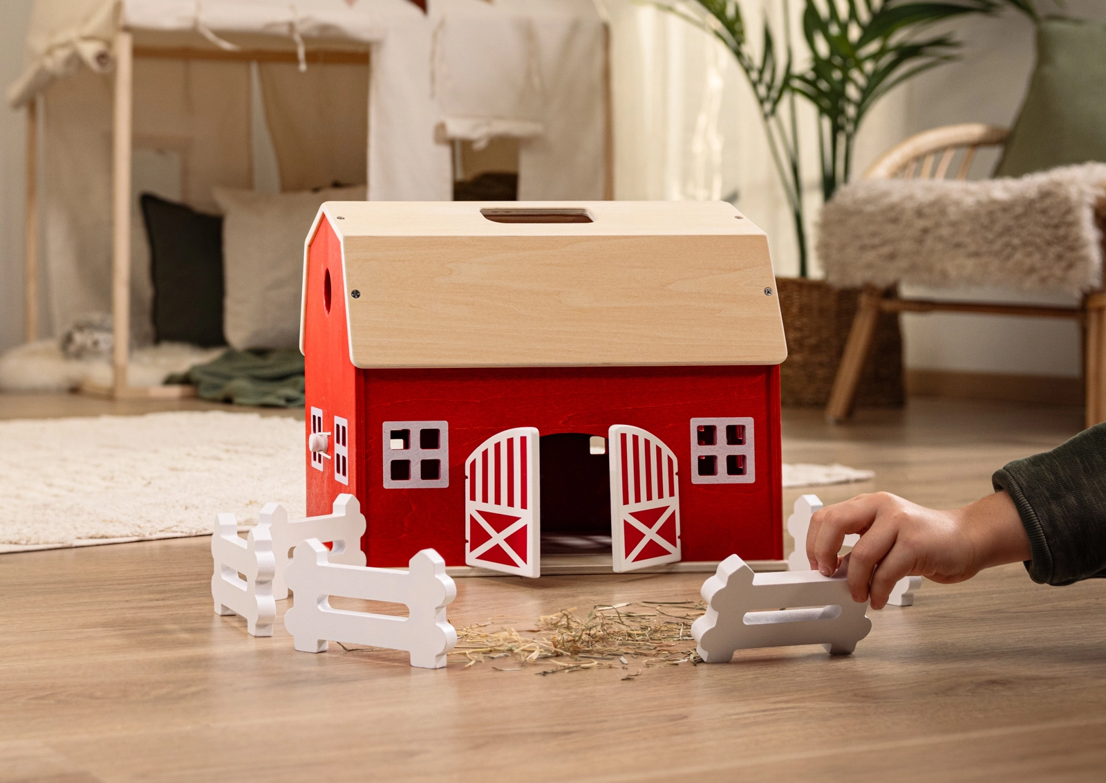 Díky zabudovanému držadlu je farma ideální i na cesty. Promyšlené detaily, jako velká vrata a vysoká střecha, podporují fantazii a rozvoj jemné motoriky. Perfektní doplněk k figurkám a příslušenství SCHLEICH – stačí připravit ohradu a zvířata se mohou nastěhovat!