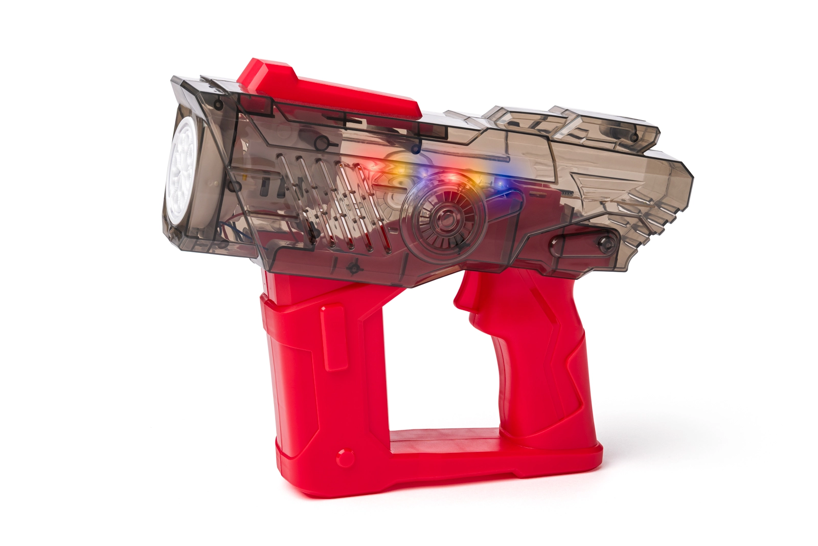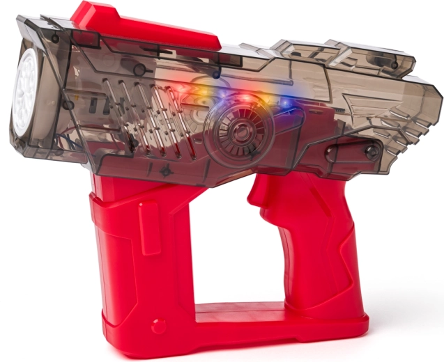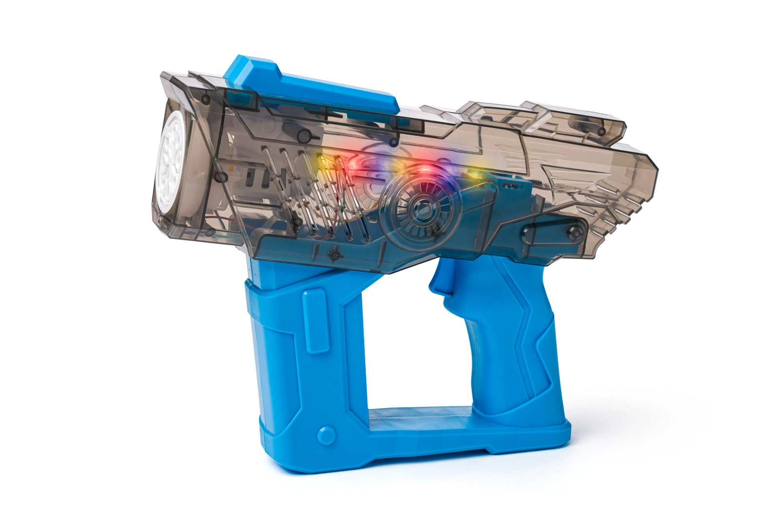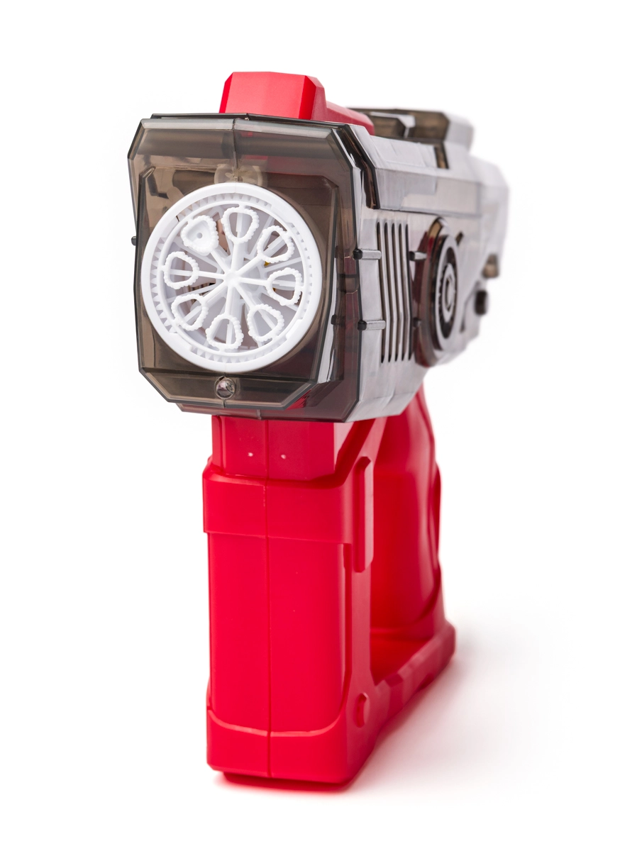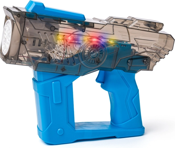 Zařízení má ergonomickou rukojeť pro pohodlné držení, jednoduché spouštění a průhledné tělo, které odhaluje vnitřní mechanismus. V balení najdete 55 ml roztoku a blaster je připraven k akci během chvilky – stačí vložit 4× AA baterie (nejsou součástí). Produkt je dodáván v open box balení a v náhodném mixu dvou barev (modrá/červená).