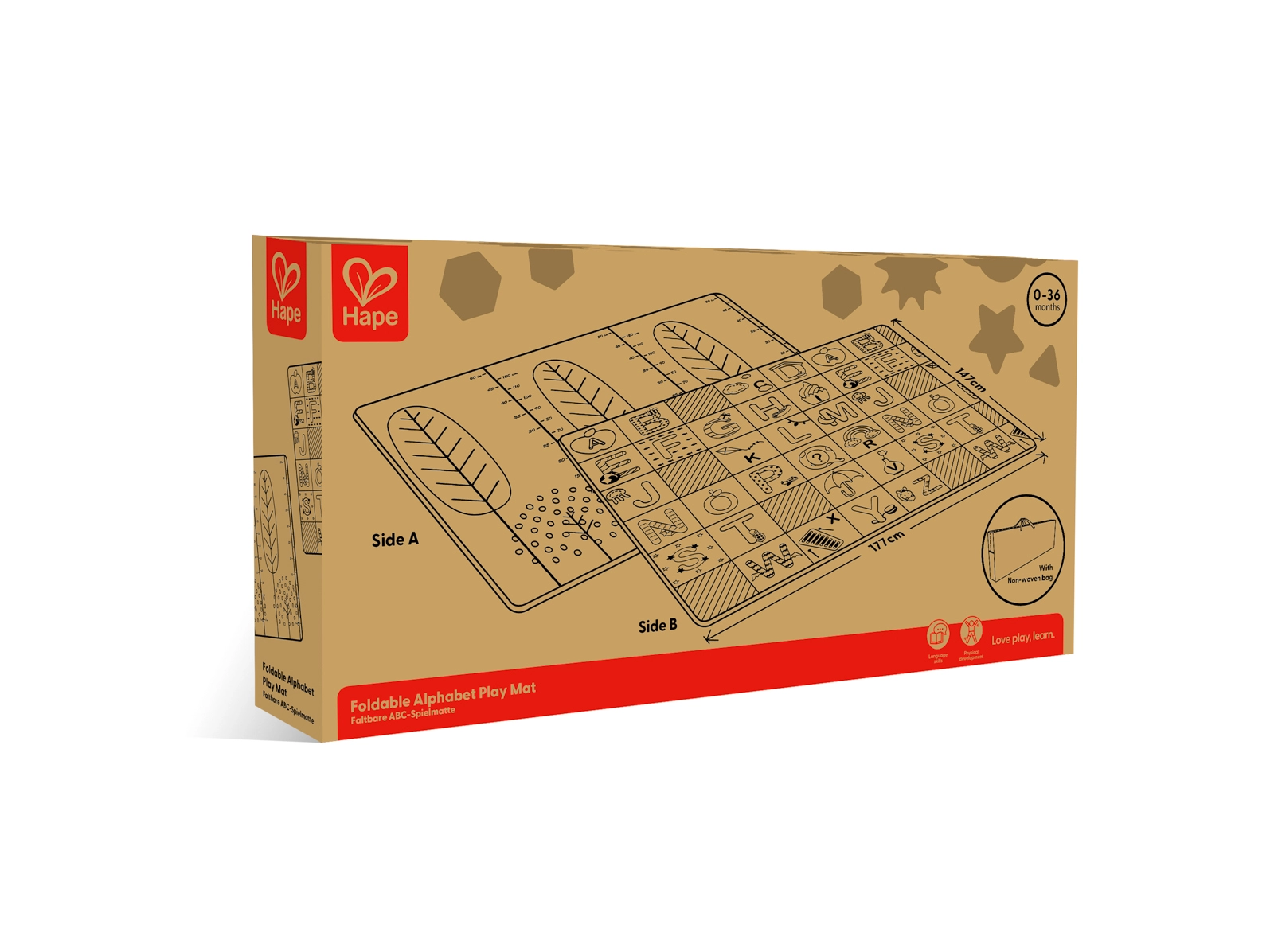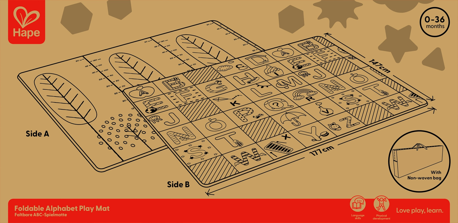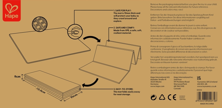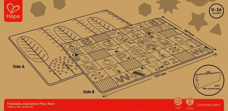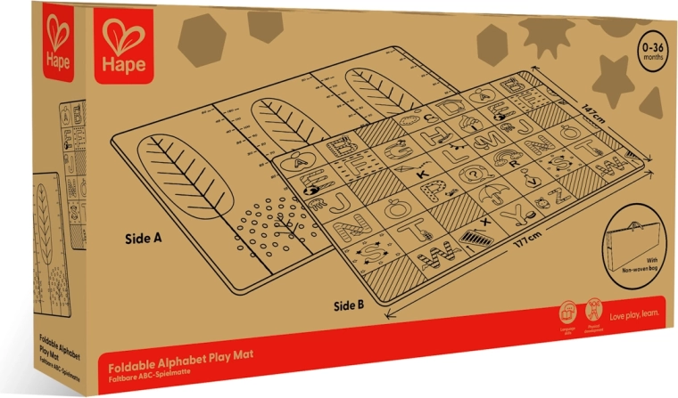 Tato skládací podložka HAPE poskytuje dětem bezpečné a pohodlné místo pro první objevování světa. Velkorysé rozměry 147 × 177 × 1 cm zajišťují dostatek prostoru na hraní, zatímco oboustranný design kombinuje edukační abecedu s praktickou výškovou stupnicí pro zábavné sledování růstu.