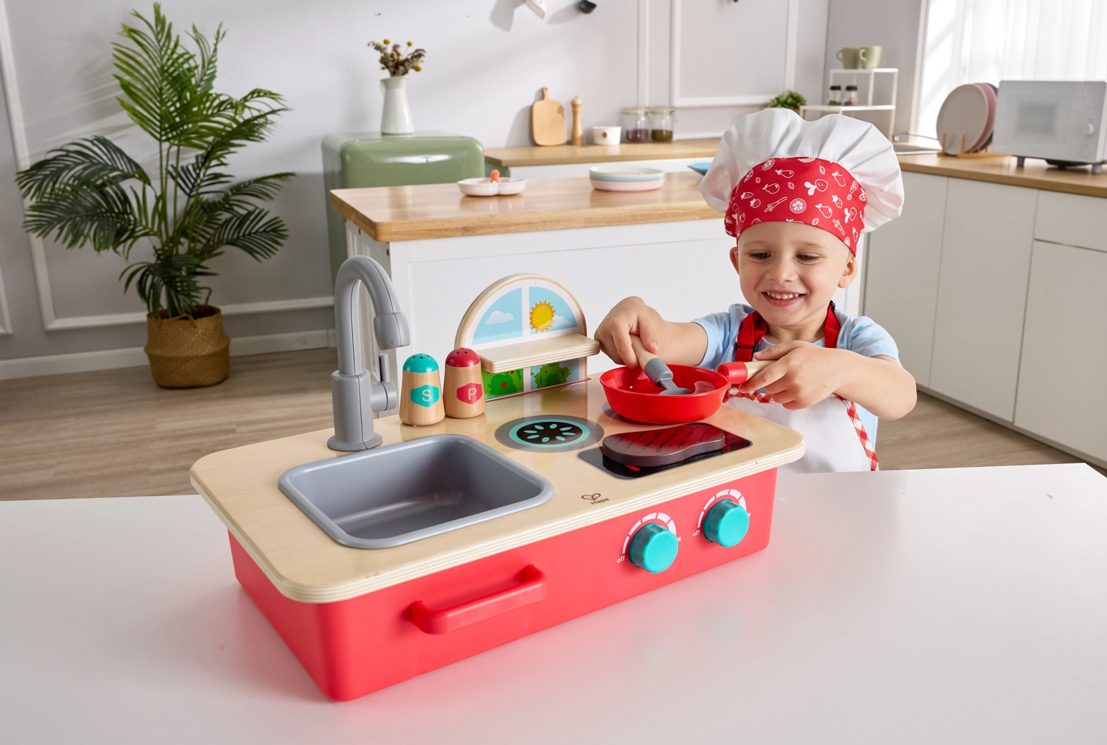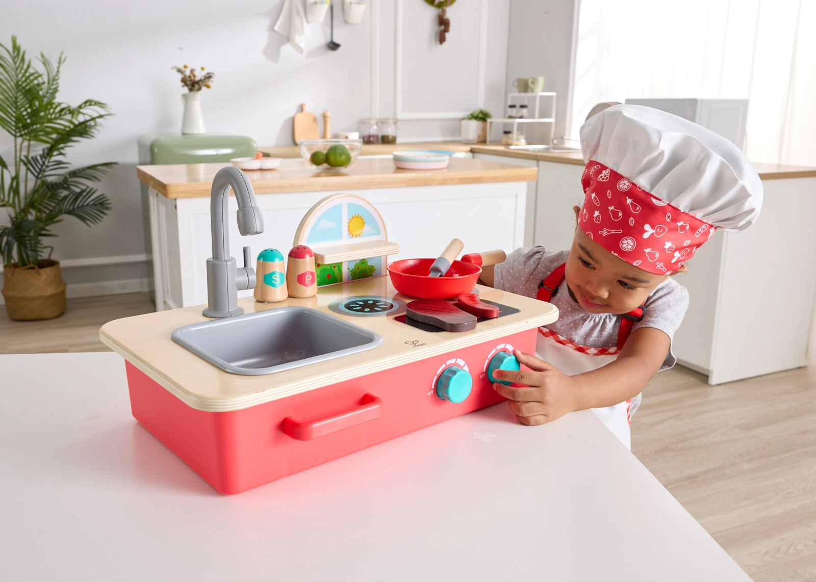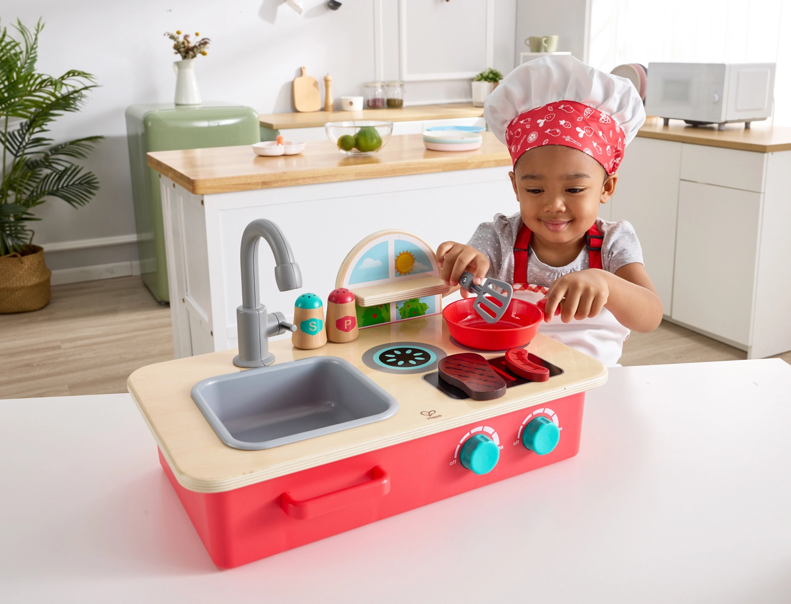 Objevte zábavu z vaření s kompaktní stolní kuchyňkou Cook & Create. Děti potěší dva vařiči s otočnými knoflíky a autentickými zvuky bublání a prskání, odnímatelný dřez s otočným kohoutkem a praktická polička na kořenky. Kuchyňku snadno postavíte na stůl nebo podlahu, takže si děti zahrají kdekoli.