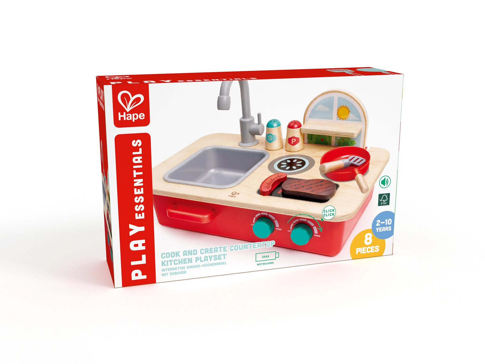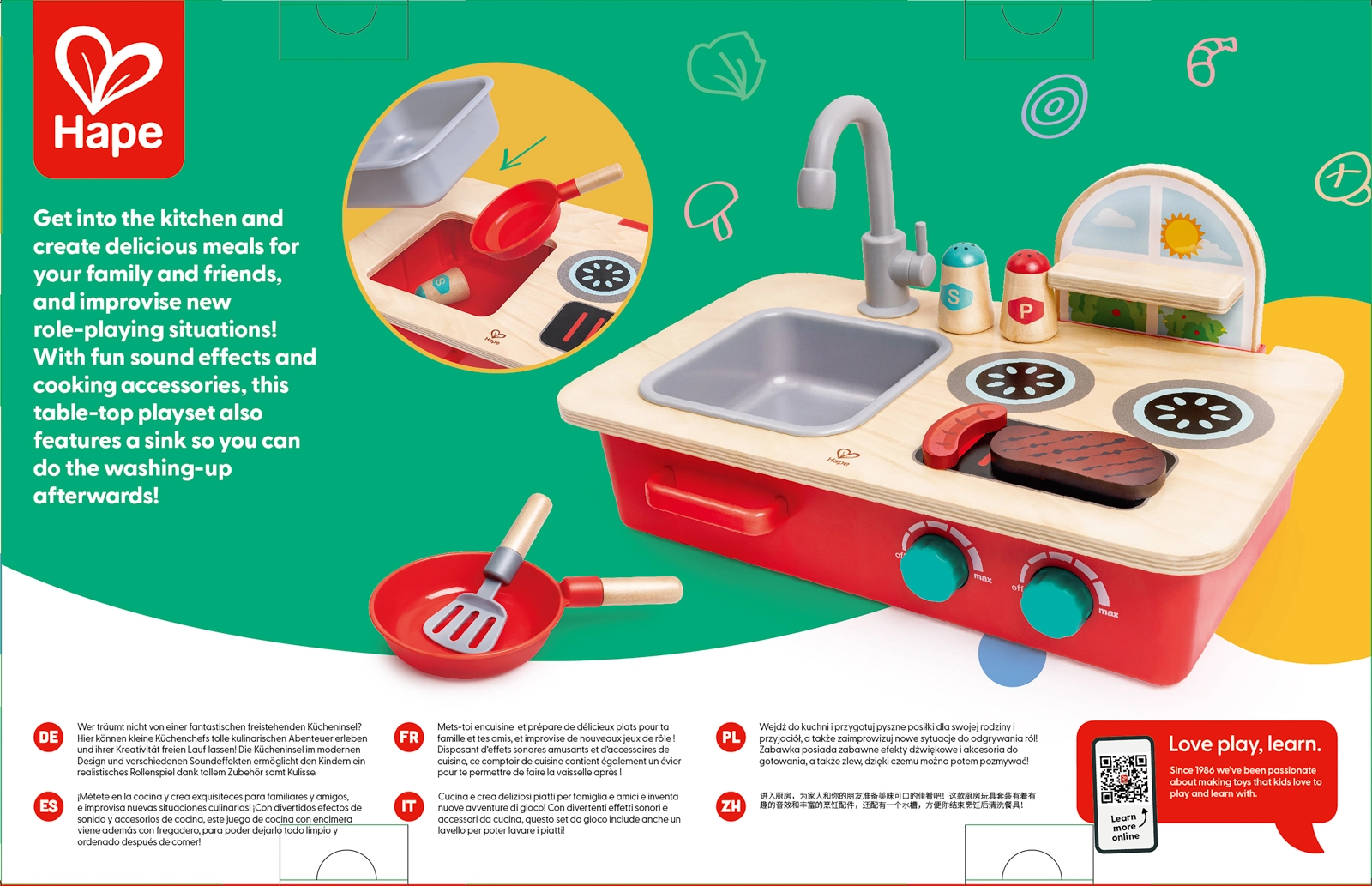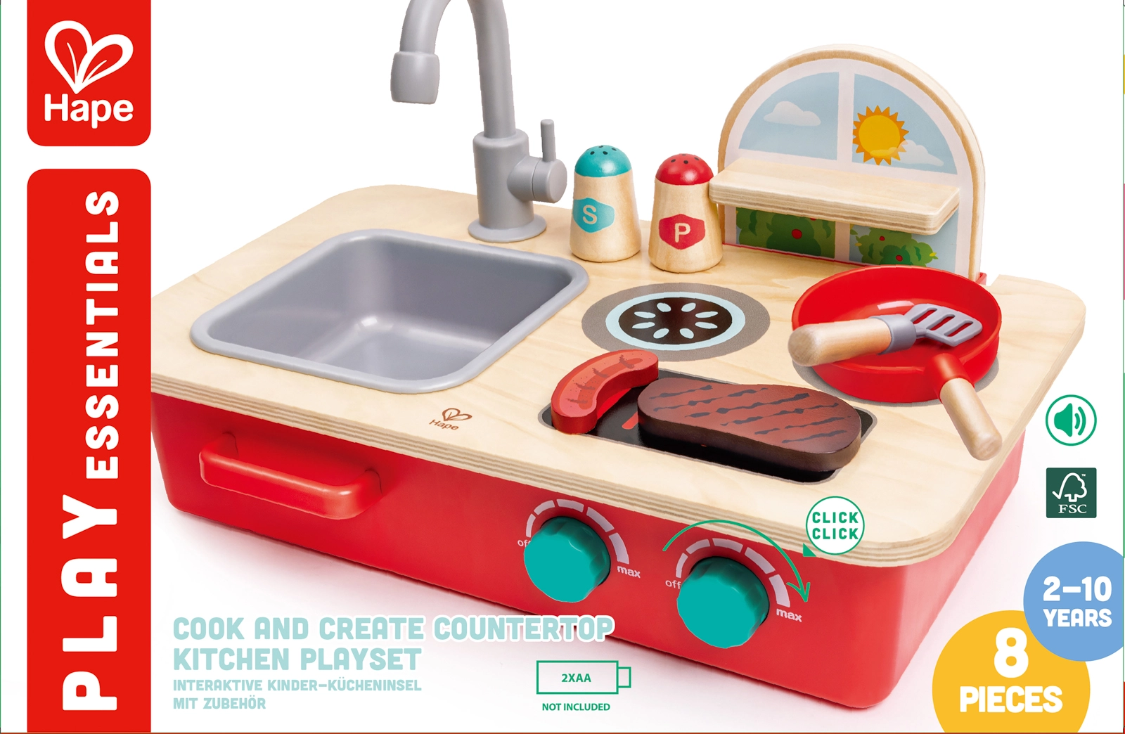 Objevte zábavu z vaření s kompaktní stolní kuchyňkou Cook & Create. Děti potěší dva vařiči s otočnými knoflíky a autentickými zvuky bublání a prskání, odnímatelný dřez s otočným kohoutkem a praktická polička na kořenky. Kuchyňku snadno postavíte na stůl nebo podlahu, takže si děti zahrají kdekoli.