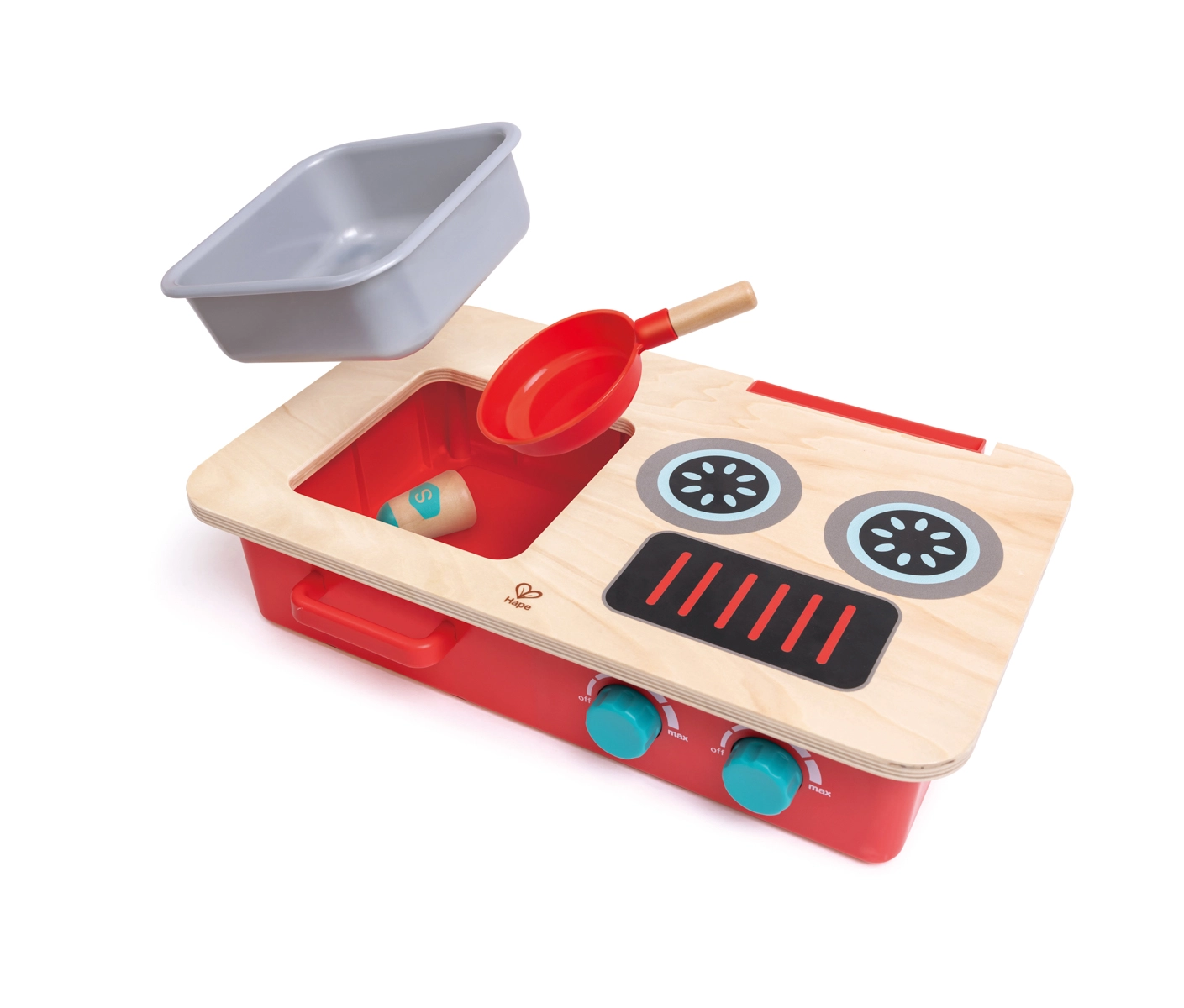 Součástí je široká sada doplňků: pánev, obracečka, talíř, utěrka, dvě kořenky a hračky potravin (párek, ryba, plátek masa). Kvalitní dřevěná konstrukce s hladkým a bezpečným povrchem zaručuje dlouhou životnost i pohodlné čištění po každé „hostině“.
