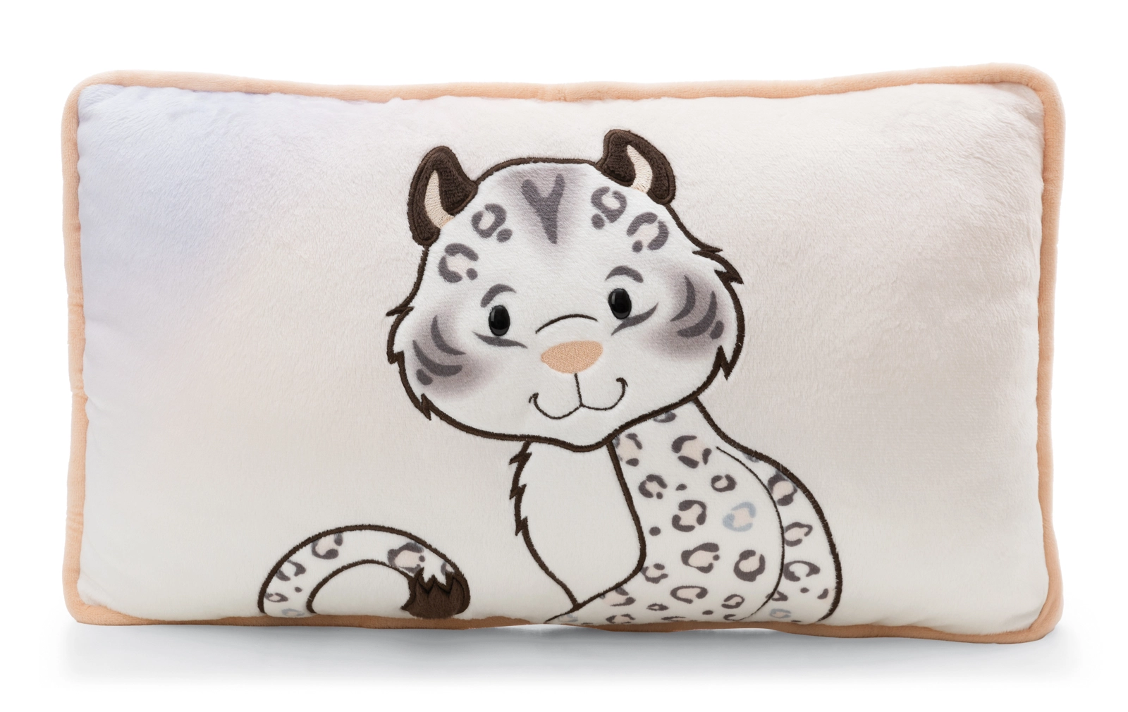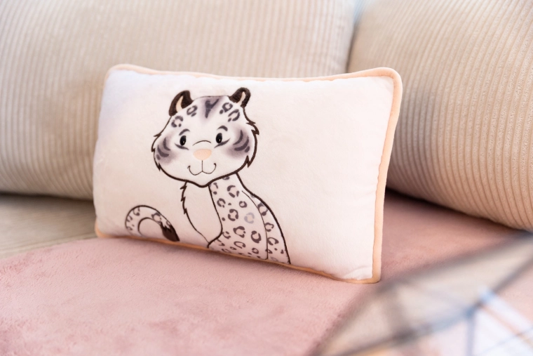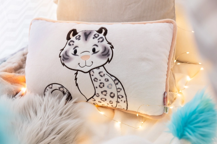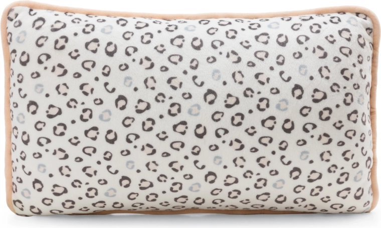 Přední stranu zdobí roztomilá aplikace sněžného leoparda, zadní strana má stylový leopardí vzor – ideální pro dekor i odpočinek.