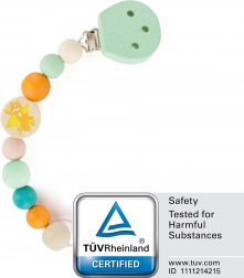 Praktický a stylový klips na dudlík z přírodního dřeva udrží dudlík stále na dosah a v čistotě. Je odolný proti slinám, vyrobený z bezpečných, netoxických materiálů a barevné korálky s tvary podporují rozvoj jemné motoriky už od narození.