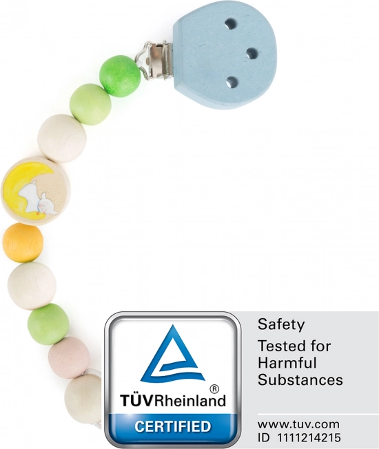 Vyrobeno z kvalitního dřeva s hladkým povrchem a bezpečnými barvami bez toxických látek. Odolnost proti slinám a robustní zpracování zajišťují dlouhou životnost. Univerzální poutko pasuje na většinu dudlíků s kroužkem.