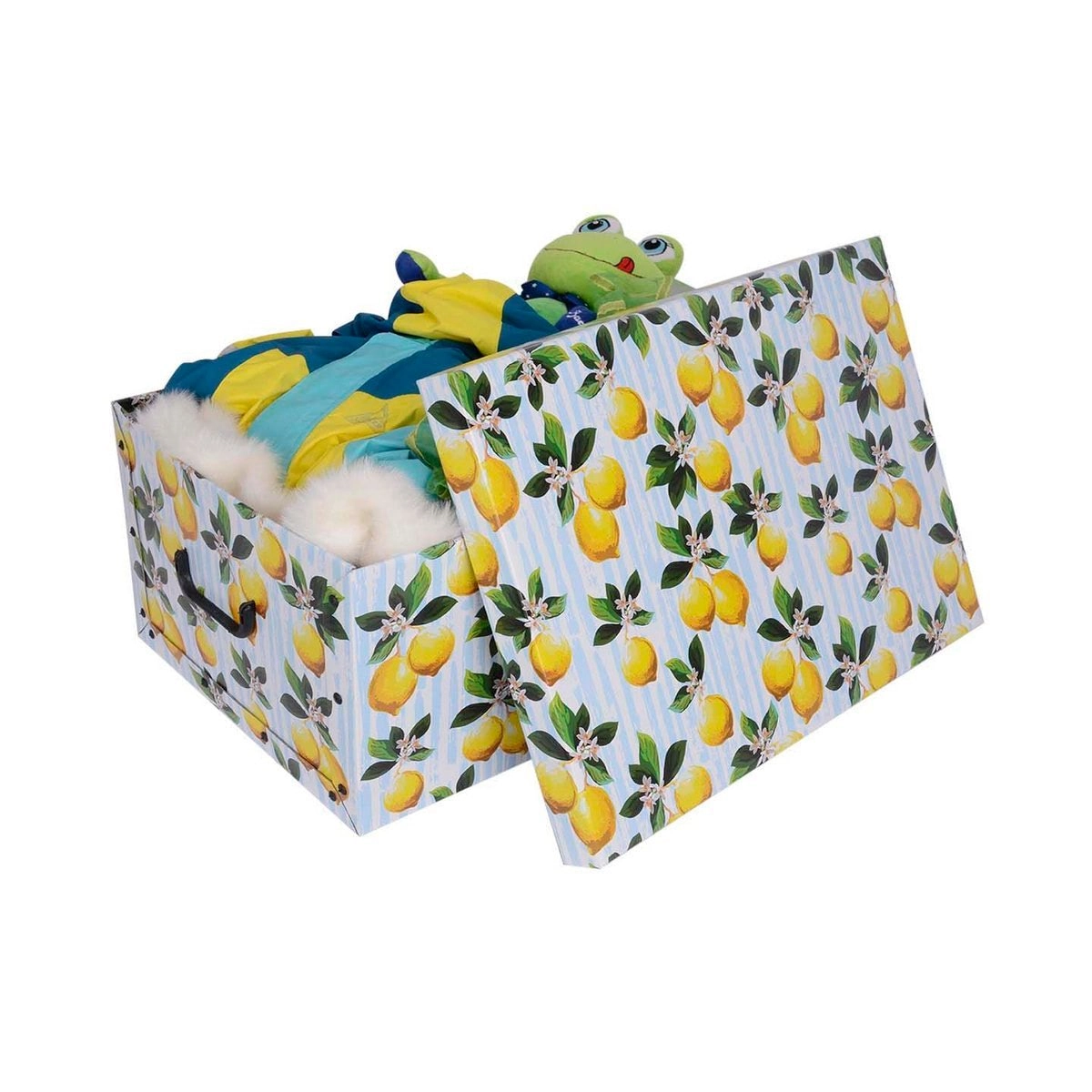 Krabice MAXI je ideální pro přehledné ukládání oblečení, dokumentů, hraček a doplňků. Motiv citrónů dodá interiéru energický a svěží akcent, zatímco kvalitní zpracování zajistí dlouhou životnost a pohodlné používání. Díky úchytům se snadno přenáší a hodí se do skříně, regálu i otevřených polic.