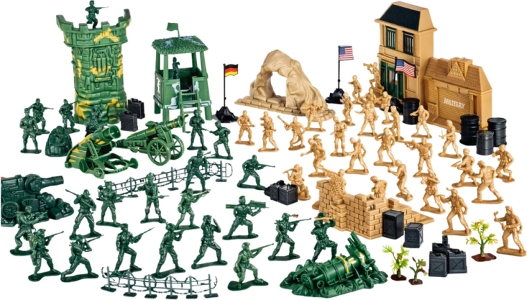 - Různorodé figurky a doplňky: vojáčci, vozidla, děla, zbraně, bariéry, vlajky, ploty