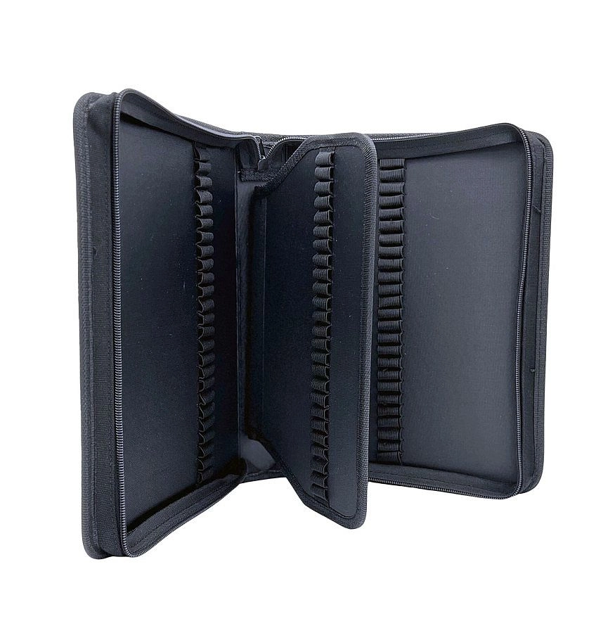 Levá strana obsahuje 25 úchopů, vnitřní klopová část poskytuje 2 × 25 úchopů (z každé strany klopy), a pravá strana přidává dalších 25 úchopů. Spolehlivé zapínání na zip udrží obsah v bezpečí při přenášení a prezentaci.