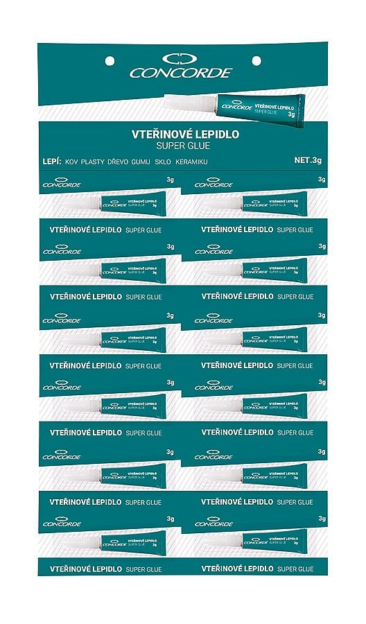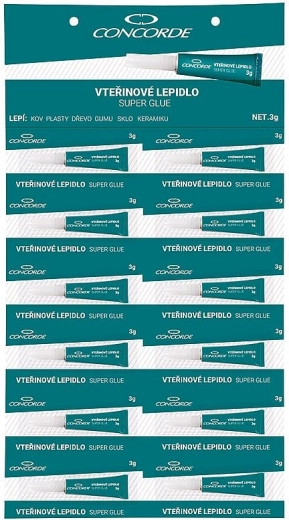 Univerzální vteřinové lepidlo CONCORDE o hmotnosti 3 g pro rychlé a pevné opravy v domácnosti i dílně. Vhodné na kov, plasty, dřevo, gumu, sklo a keramiku. Poskytuje okamžitý účinek a po vytvrdnutí zanechává průhledný spoj s pevností až 140 kg/cm².