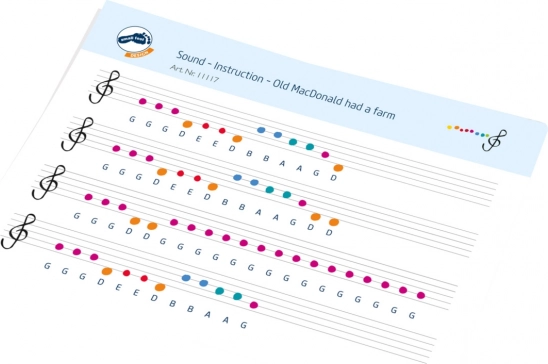Přiložené barevně značené notové listy (např. „Old MacDonald“) pomáhají dětem přiřazovat barvy k tónům a rychle si osvojit první melodie.