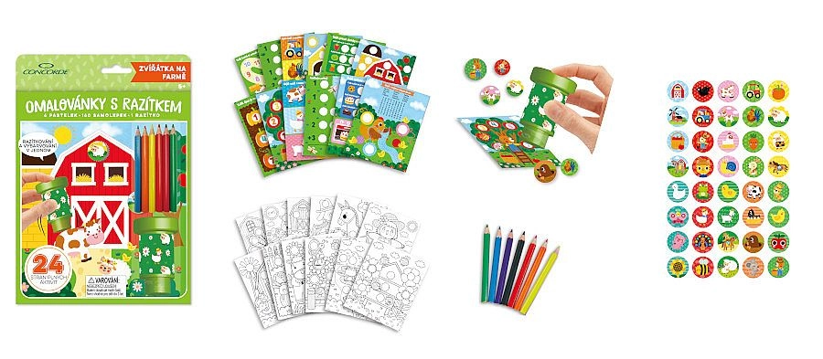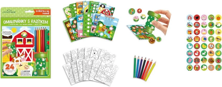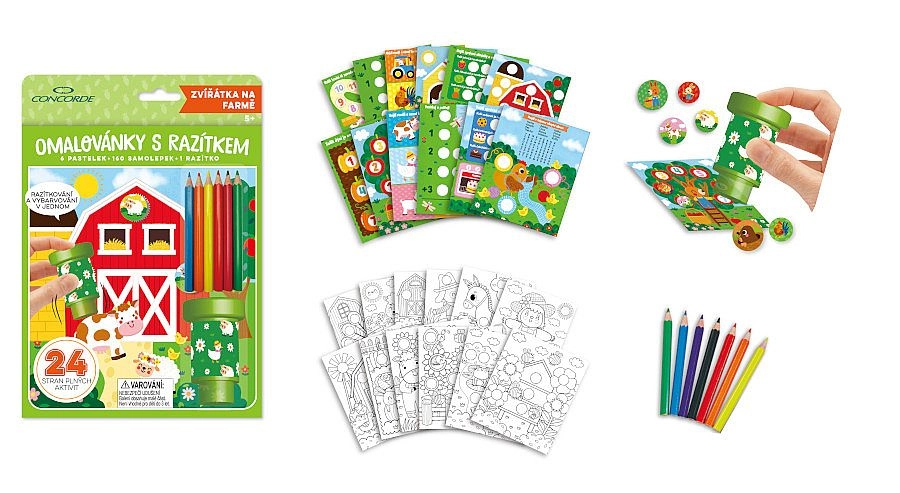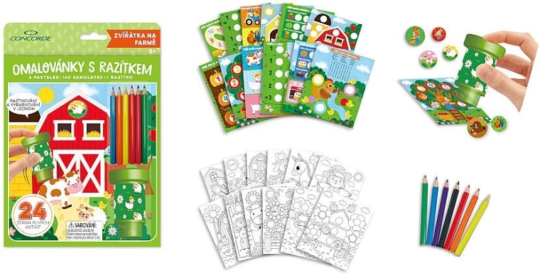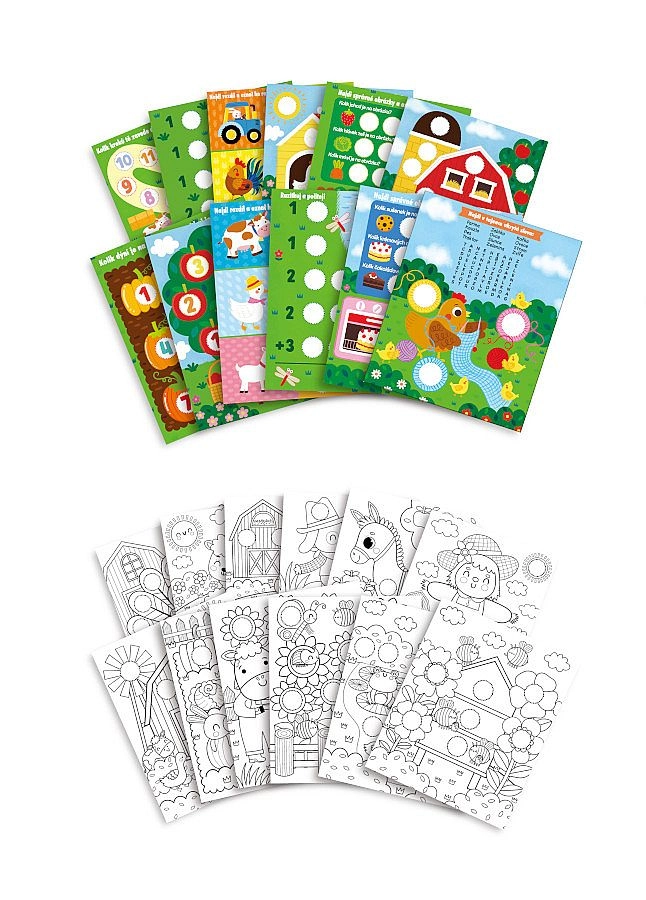 Sada obsahuje 12 stránek s úkoly a 12 stránek k vybarvování, 160 samolepek s motivy zvířat, traktorů a dalších prvků z farmy, jedno razítko a 6 pastelek. Ideální na doma, na cesty i jako kreativní dárek.