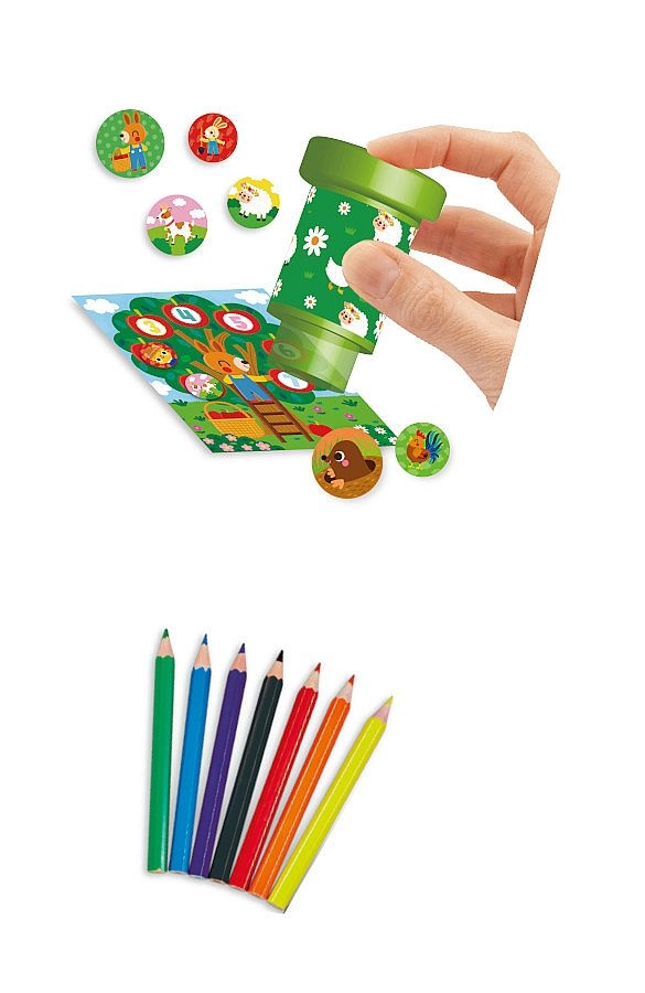 Kreativní sada, která spojuje razítkování, omalovánky a samolepky v jedné krabičce. Najdete v ní 24 aktivitních stran, 160 snadno odlepitelných samolepek s farmářskými motivy, 1 praktické razítko a 6 barevných pastelek – vše pro zábavné učení a rozvoj jemné motoriky.