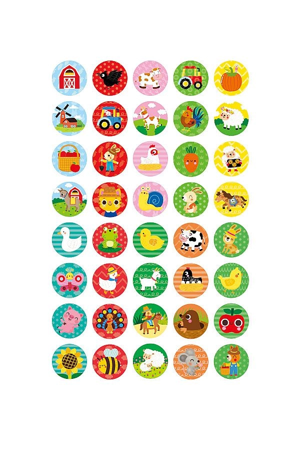 Velké množství kulatých samolepek se zvířátky, traktory, zeleninou a dalšími motivy pro dekorování, odměňování i tvoření deníčků.