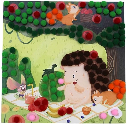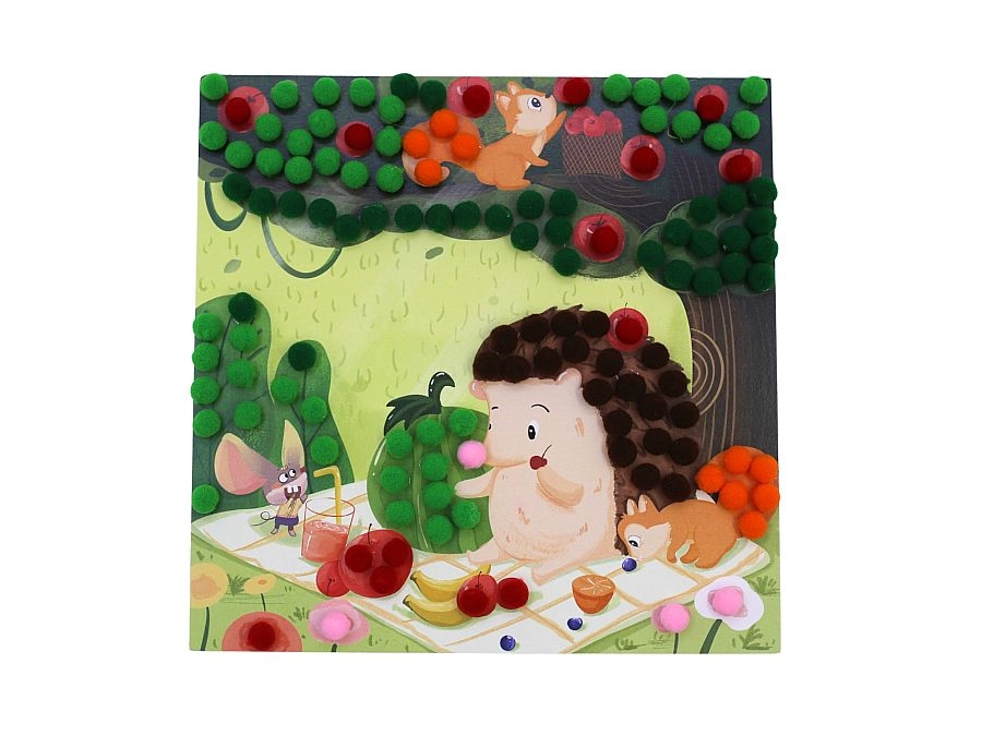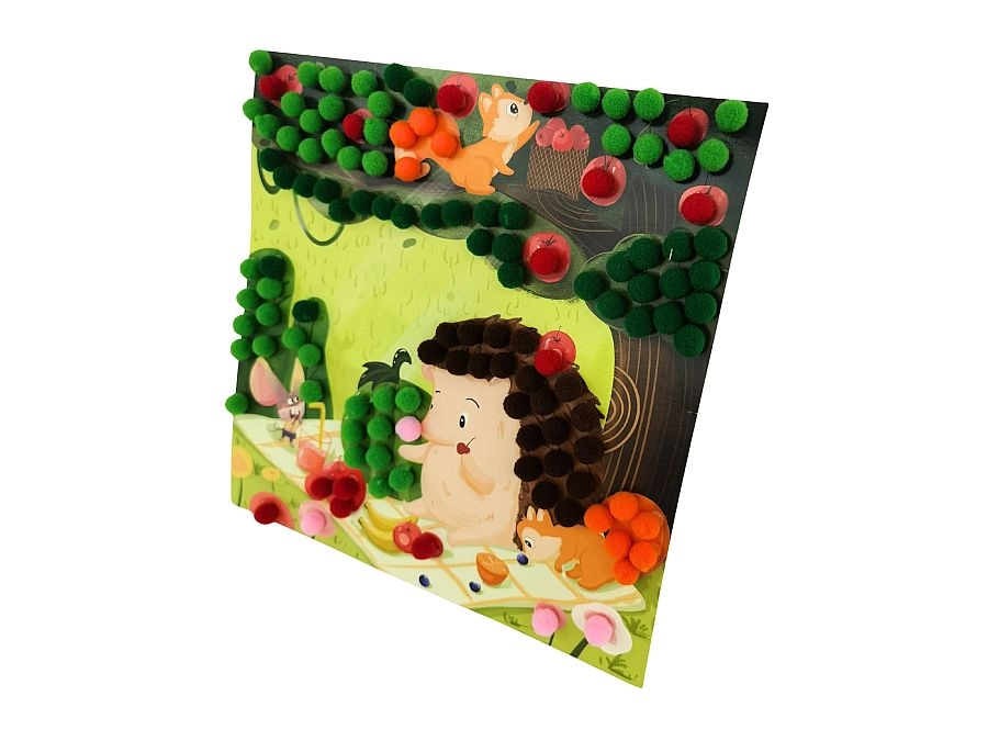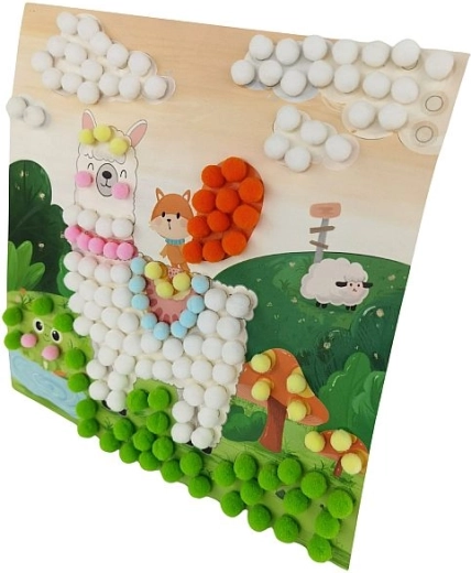 Samolepicí podložky usnadňují práci bez potřeby lepidla a udržují pracovní plochu čistou. Barevné pompony lákají k dotyku, podporují smyslové vnímání a vedou děti k soustředění a přesnosti.