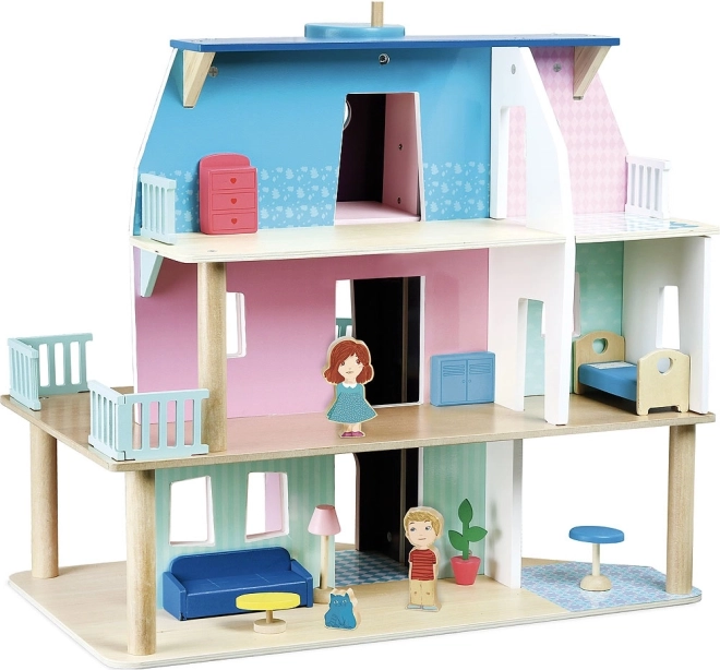 Domeček zaujme svým barevným provedením s růžovou fasádou a modrou střechou. Nabízí několik podlaží, balkóny a je vybaven nábytkem a dekoracemi.