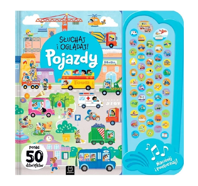 Součástí je zvukový panel s přehledným ovládáním: barevné záložky napoví, které zvuky k dané stránce patří, a děti si samy přehrají více než 50 realistických zvuků strojů a vozidel. Jednoduché ovládání stiskem kroužku usnadní použití i menším dětem.