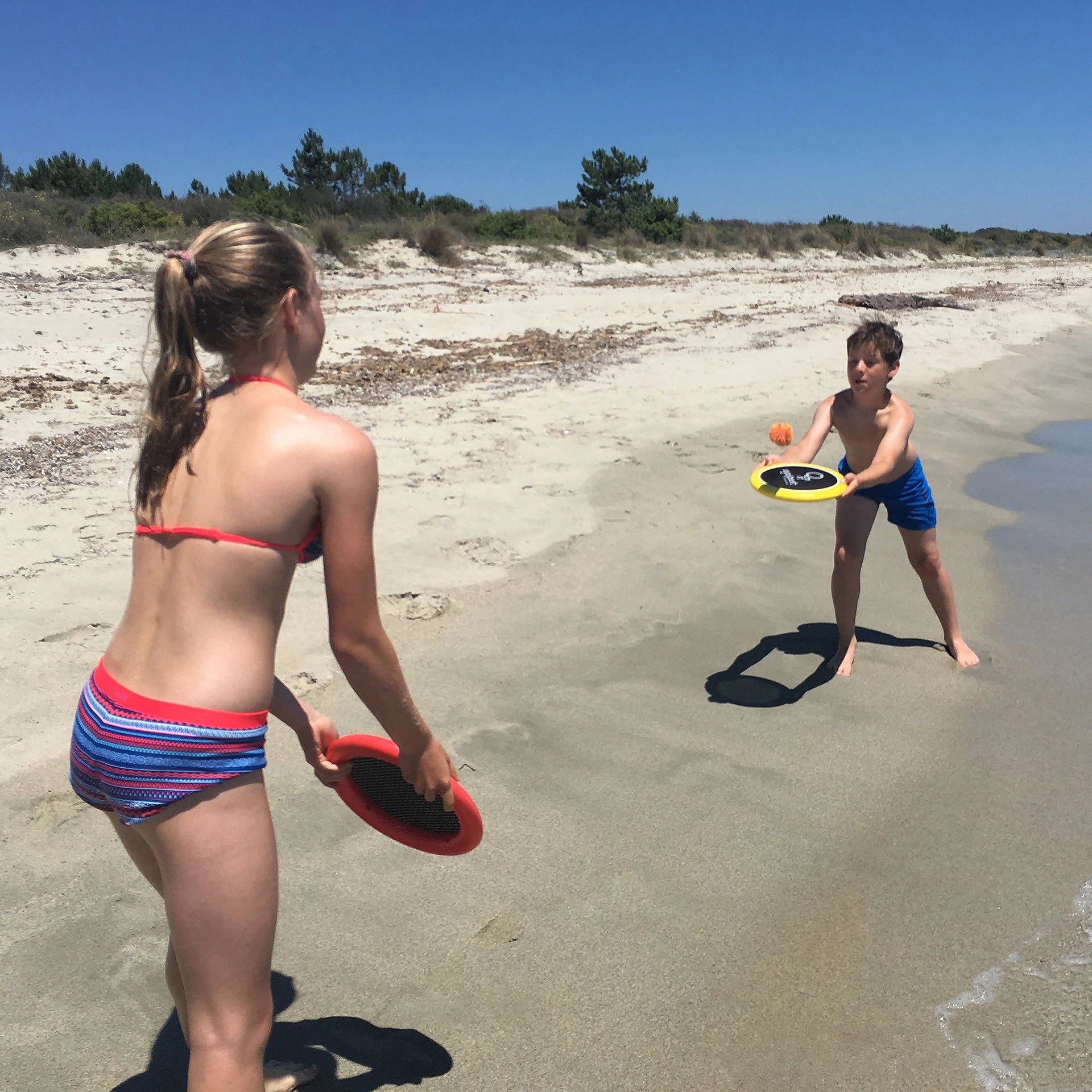 Sada SCHILDKRÖT OGO SPORT přináší univerzální venkovní hru pro děti i dospělé. Díky odolné elastické síťovině mají disky vynikající trampolínový efekt, takže míček letí vysoko a daleko, a přitom se snadno ovládá. Pěnový okraj zajišťuje pohodlný úchop a snižuje riziko nárazu.