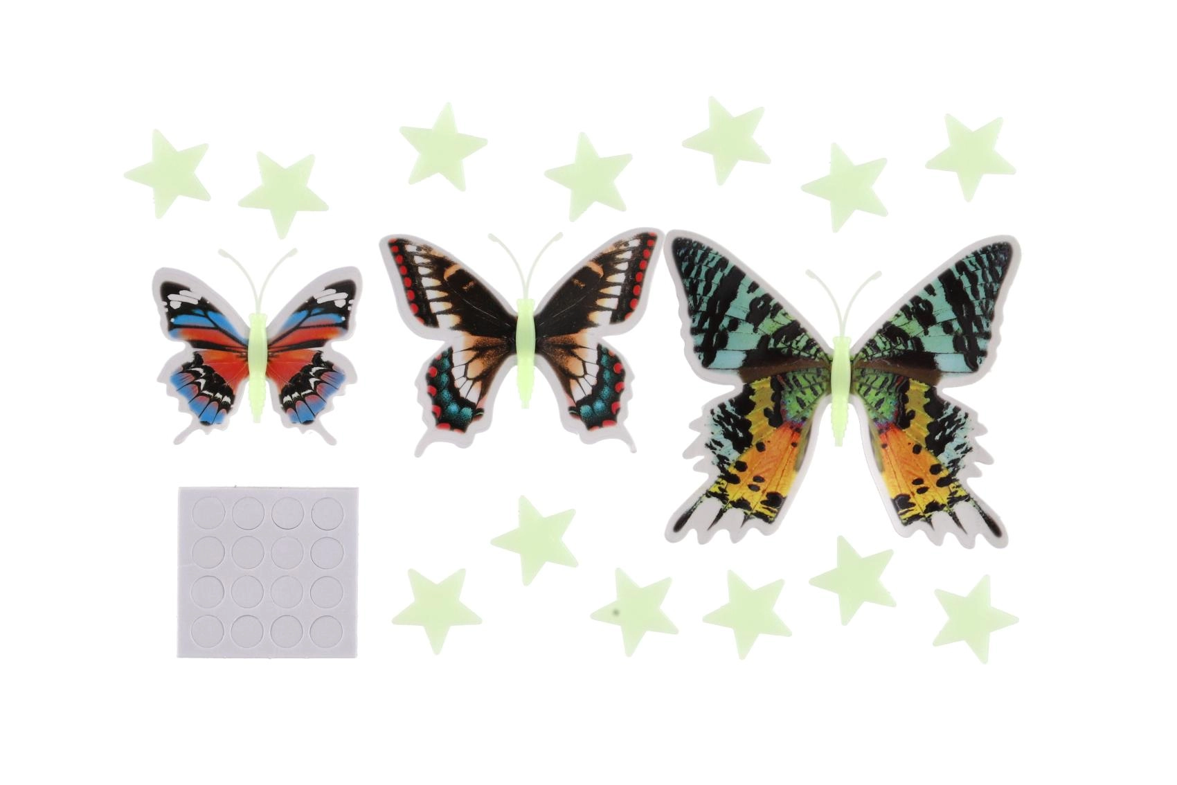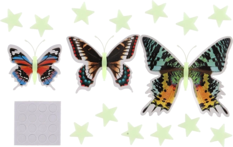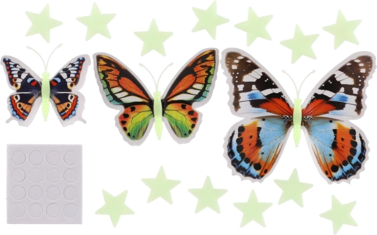 Kouzelná sada barevných motýlů a hvězdiček, které ve tmě září a vytvářejí příjemnou atmosféru pro usínání. Jednoduchá instalace pomocí samolepicích bodů, 3D efekt motýlích křídel a svítící hvězdy promění každou stěnu v kreativní vesmír plný fantazie.