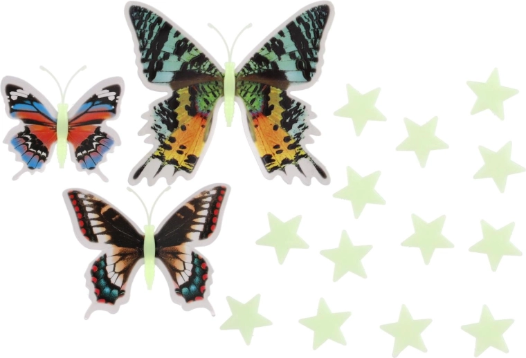 Proměňte dětský pokoj v pohádkové místo. Dekorativní motýli s plastickými křídly a sada fosforeskujících hvězdiček vytvoří jemné noční světlo, které děti uklidní a zároveň zútulní interiér. Stačí je přes den „nabít“ denním či umělým světlem a večer se rozzáří.