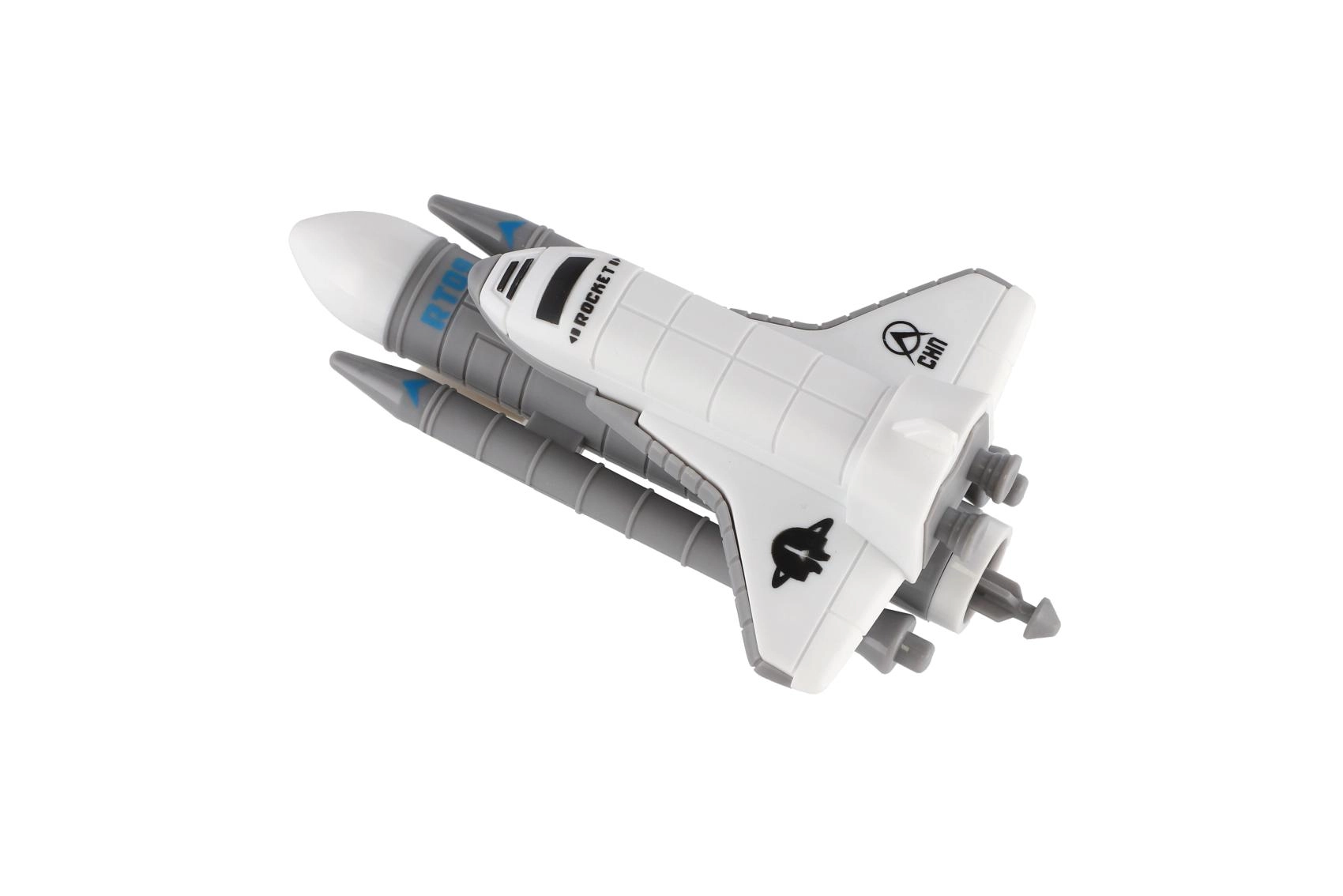 Bílý raketoplán s posilovači na šedé odpalovací plošině umožní dětem znovu a znovu simulovat start mise. Odnímatelné díly zvyšují variabilitu hry.