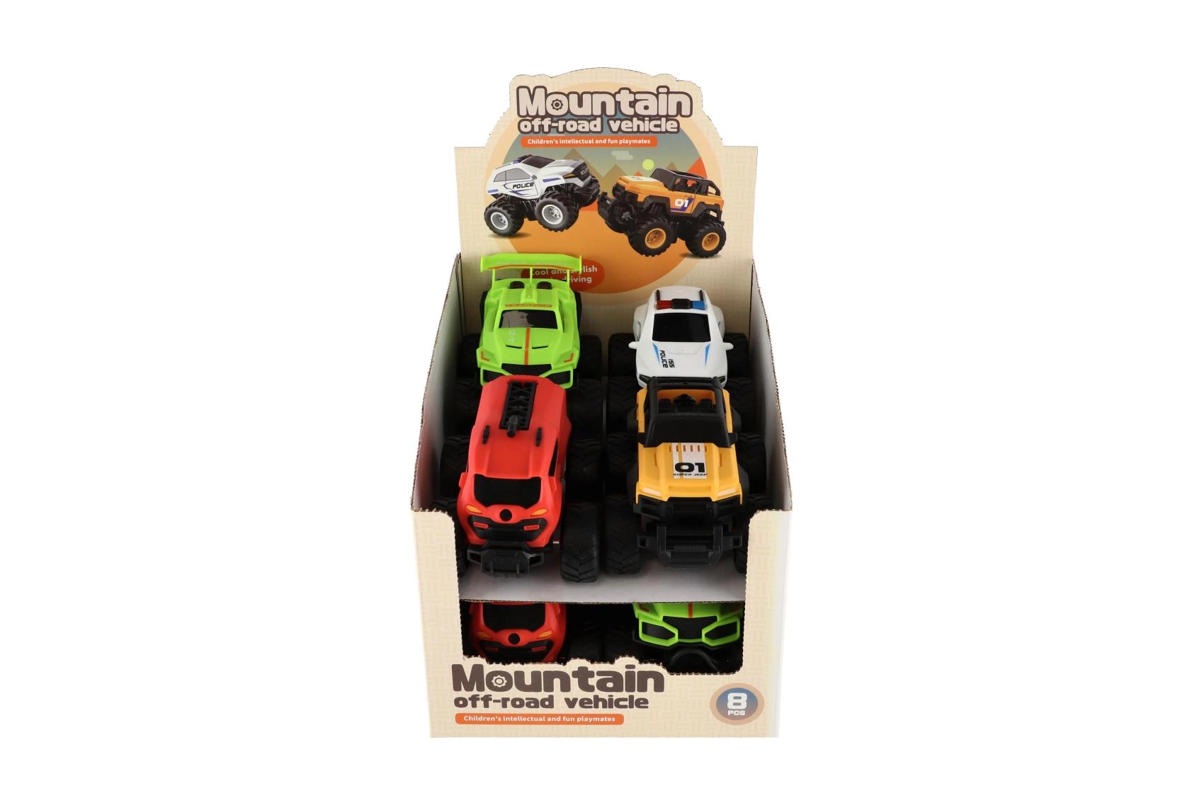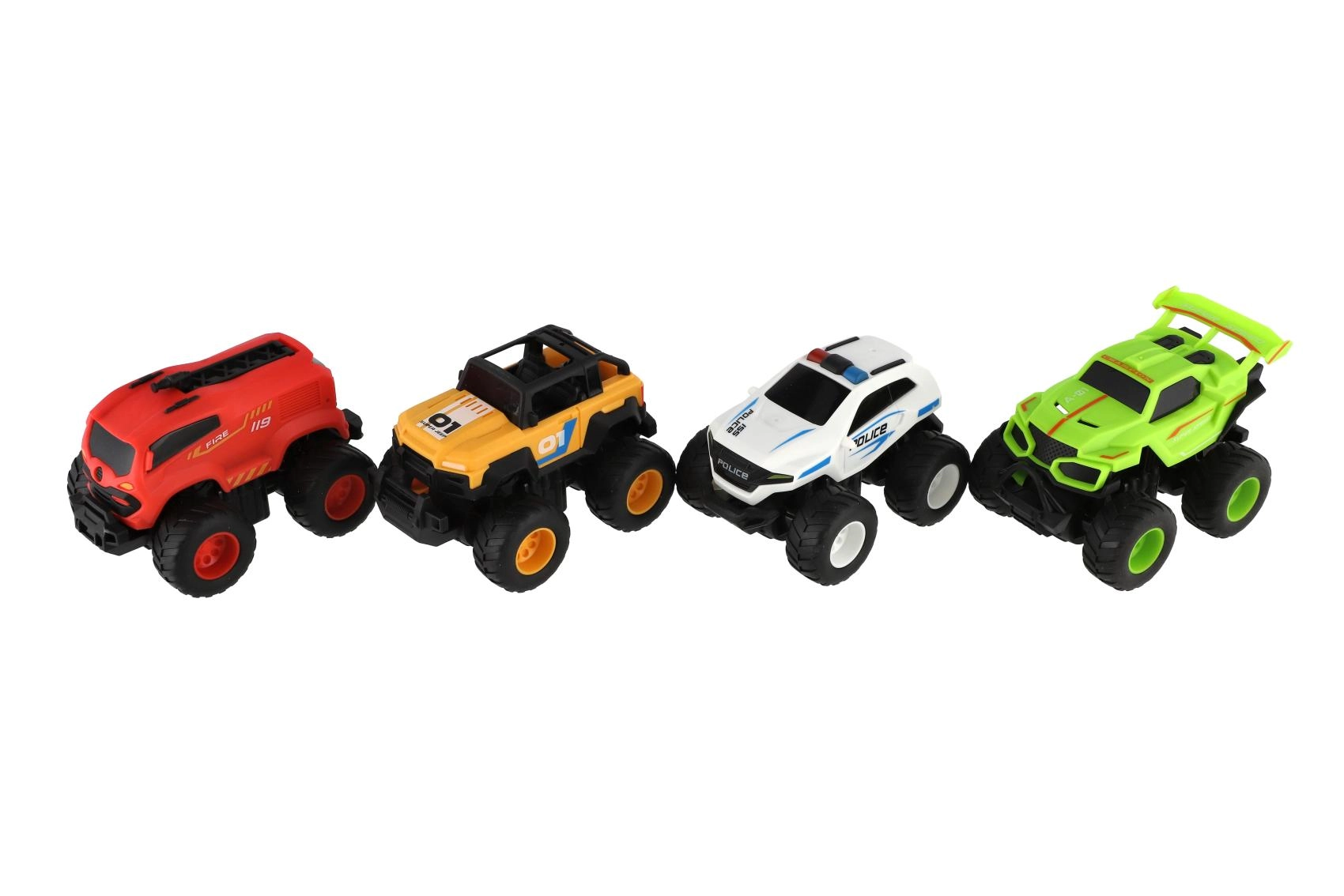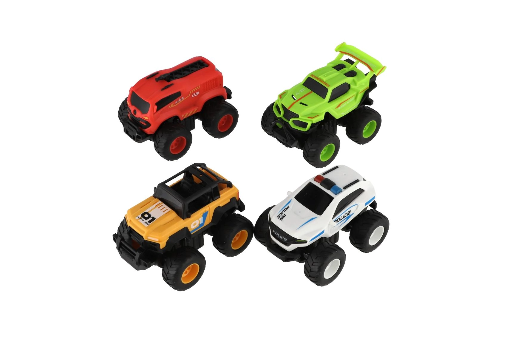 Objevte porci zábavy s kompaktními monster trucky, které zvládnou hrboly, koberce i drobné překážky. Setrvačníkový pohon zajišťuje svižnou jízdu bez baterií a velká traktůrková kola dodají stabilitu i v zatáčkách. V balení najdete 8 kusů ve 4 různých designech, včetně policejního a hasičského motivu – ideální pro závody i role‑play.