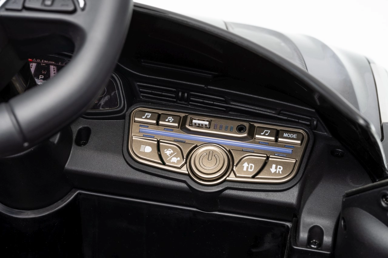 Bezpečnost a kontrolu zajišťuje rodičovský ovladač 2,4 GHz se třemi rychlostmi a funkcí Emergency Stop. Děti potěší otevírací dveře, LED světla vpředu i vzadu a přehledný kokpit. Multimediální panel dovolí přehrávat hudbu přes Bluetooth, USB, MP3 nebo AUX, nechybí zvuky a klakson na volantu.