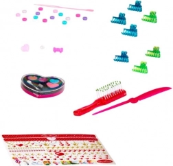 Bohatá sada příslušenství zahrnuje hřebeny, kartáč, barevné sponky, korálky, stužky, nálepky a srdíčkovou paletku „make-upu“. Vlasy jsou měkké, husté a dobře rozčesatelné, takže zvládnou časté česání a opakované účesy bez ztráty kvality. V balení najdete i obrázkové návody pro snadnou inspiraci.