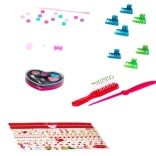 Hřeben, kartáč, korálky, sponky, stužky, nálepky, paletka "make-upu"