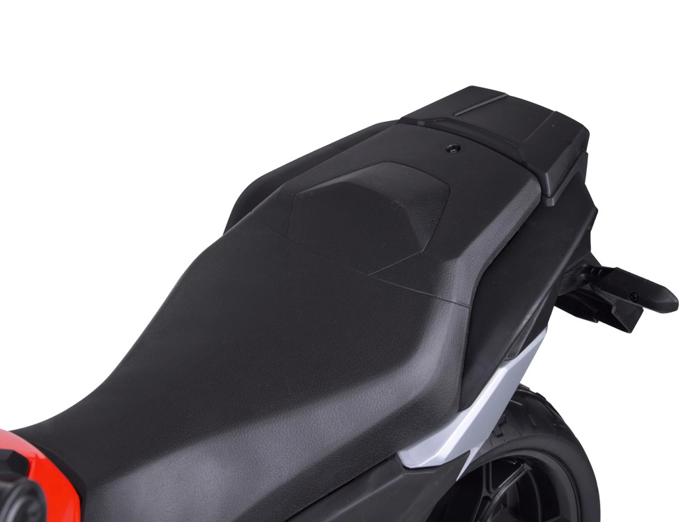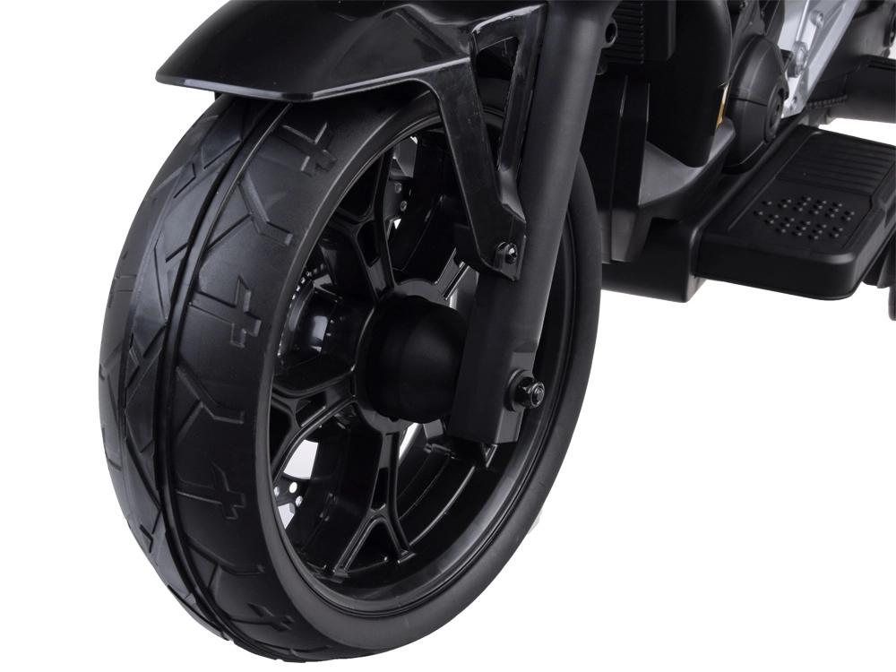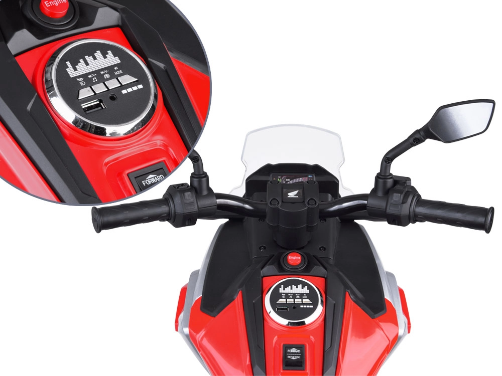 Motorka se startuje tlačítkem a po spuštění se ozve realistický zvuk startu a chodu motoru. Přední LED osvětlení podtrhuje autentický vzhled, zatímco hudební panel nabízí klakson, veselé melodie, anglické pohádky, regulaci hlasitosti a vstupy USB a Mp3 pro oblíbené skladby.