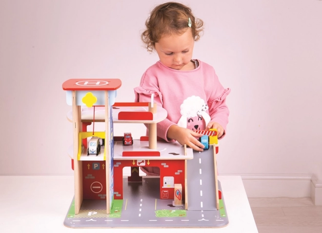 Tato robustní dřevěná garáž přináší realistické prvky skutečného parkovacího domu: děti vyvezou autíčko manuálním výtahem do vyšších pater, zaparkují na vyznačených místech a sjíždějí po rampě se závorou. V přízemí je připraven servis, autoumyvárna a čerpací stanice pro kompletní péči o vozidla.