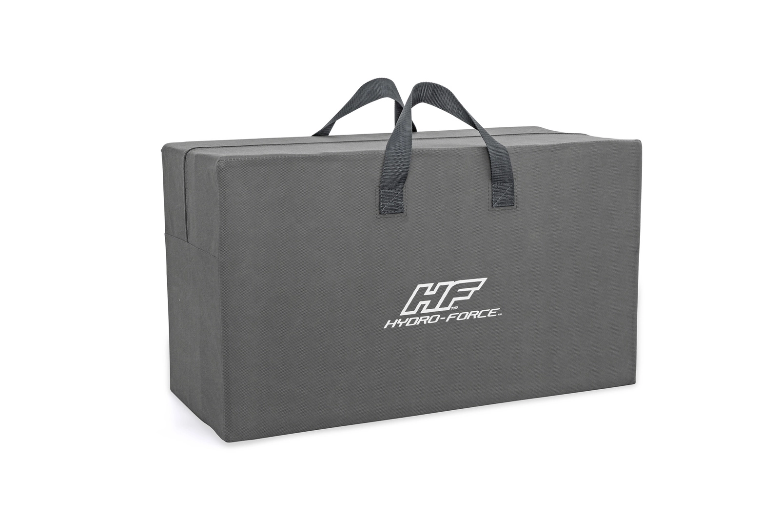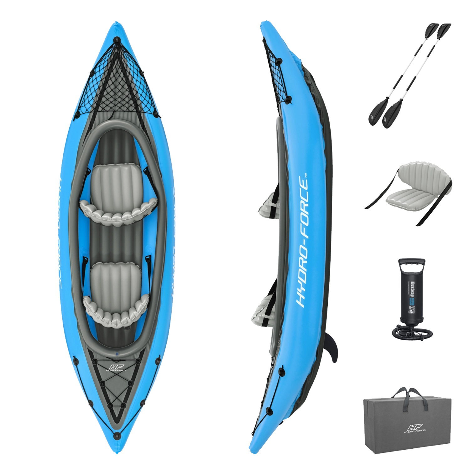 V balení získáte kajak pro 2 osoby, dvě dvojlistá pádla, ruční pumpu Air Hammer, odnímatelnou ploutev/skeg, opravnou záplatu a přepravní tašku – vyrazíte hned.