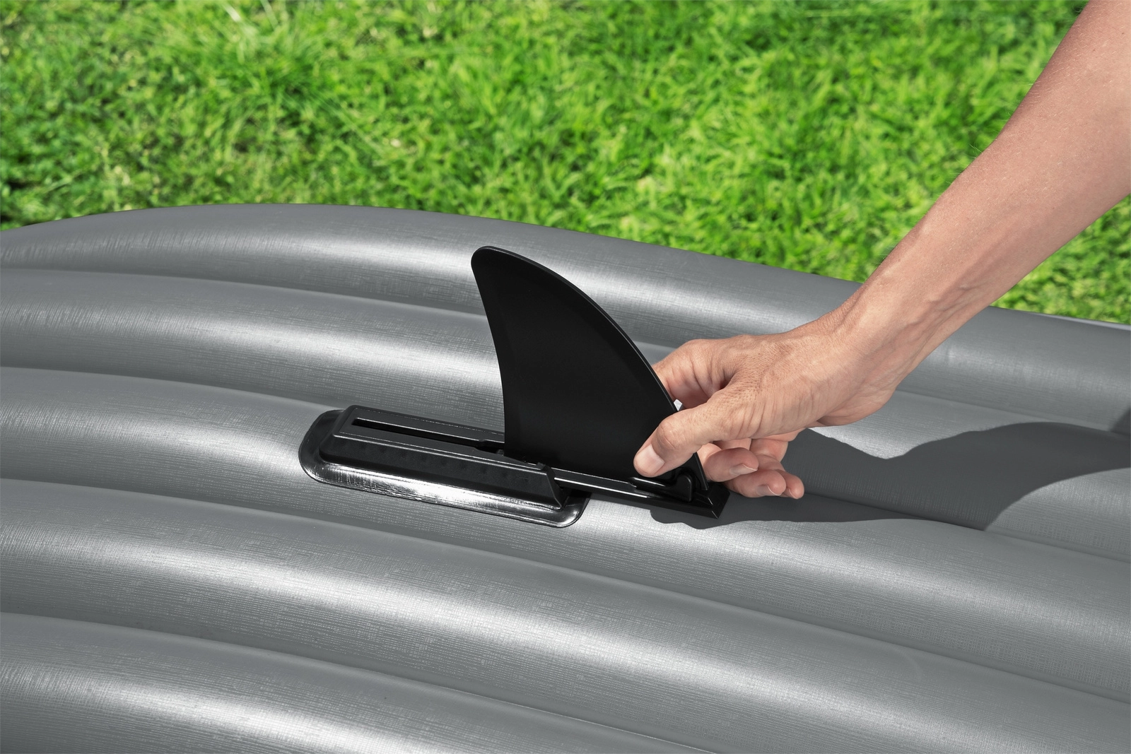 Praktické prvky jako přední a zadní bungee sítě pro uložení věcí, obvodové úchopové lano pro snadnou manipulaci a rychlouzavírací ventily pro rychlé nafouknutí/vyfouknutí šetří čas i místo. Odnímatelná ploutev (skeg) v různých velikostech pomáhá držet přímý směr a zlepšuje ovladatelnost.
