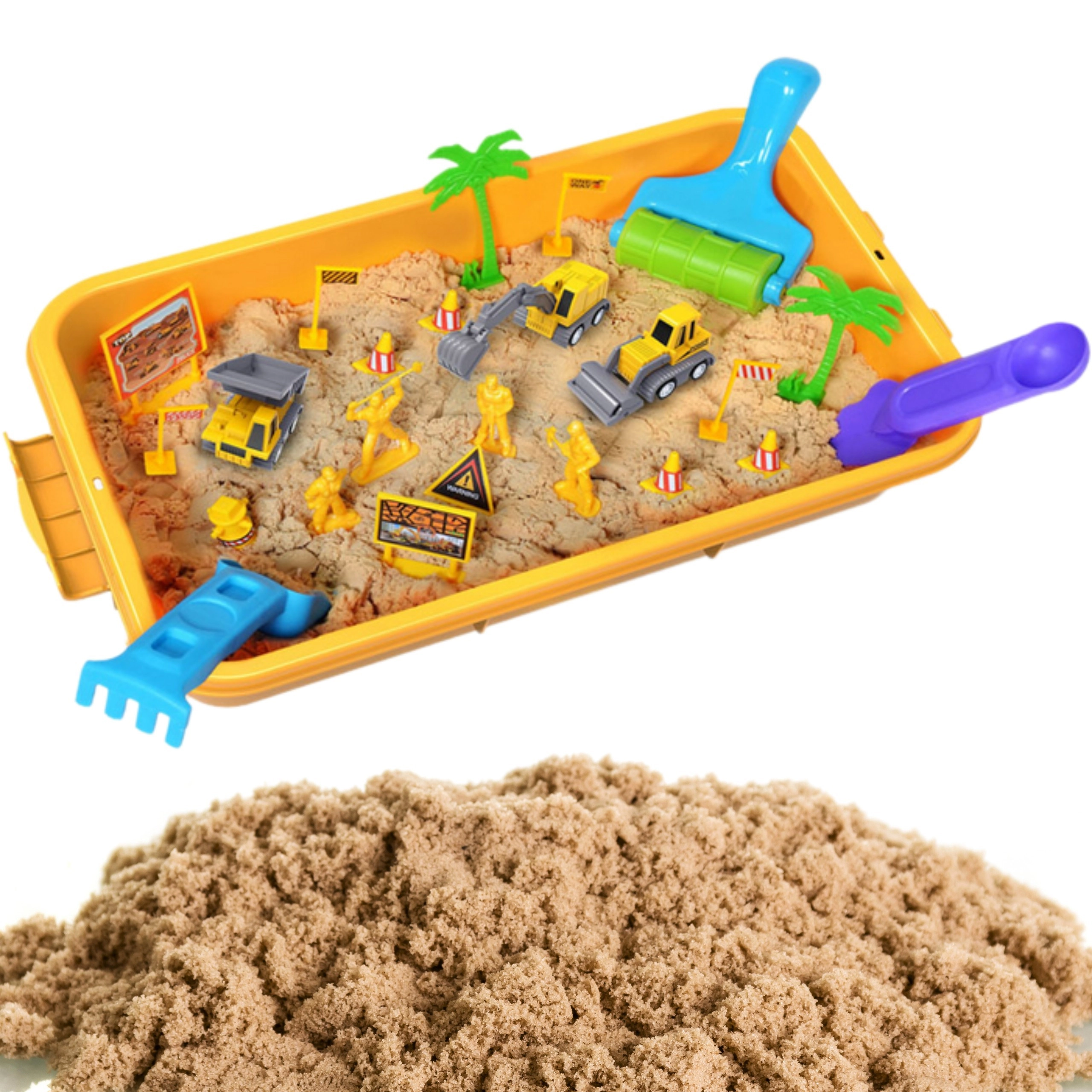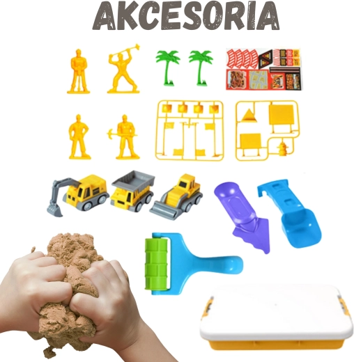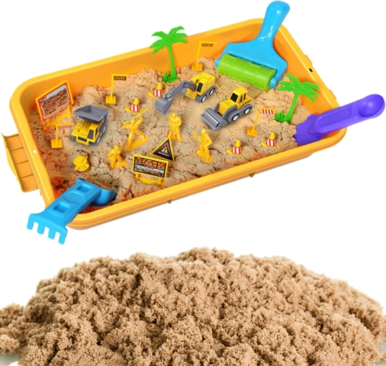 - Obsah balení: žlutý kufřík, 1 000 g kinetického písku (přírodní barva), 3 stavební vozidla, 4 figurky dělníků, dopravní a výstražné prvky (kužely, bariéry), 2 stromky (palmy), nástroje na písek: lopatka, špachtle/hráblátko, ruční váleček.