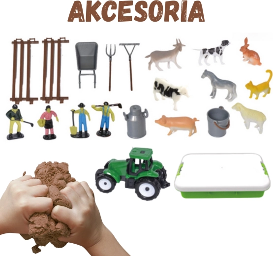 - Kufřík/kuveta, kinetický písek 1500 g, zelený traktor, 4 figurky farmářů, figurky zvířat (kůň, kráva, ovce, prasátko, koza, pes, kočka, králík), 2 díly oplocení, kolečko (tačky), vidle, hrábě, konve/baně na mléko, vědro, 6 zip sáčků